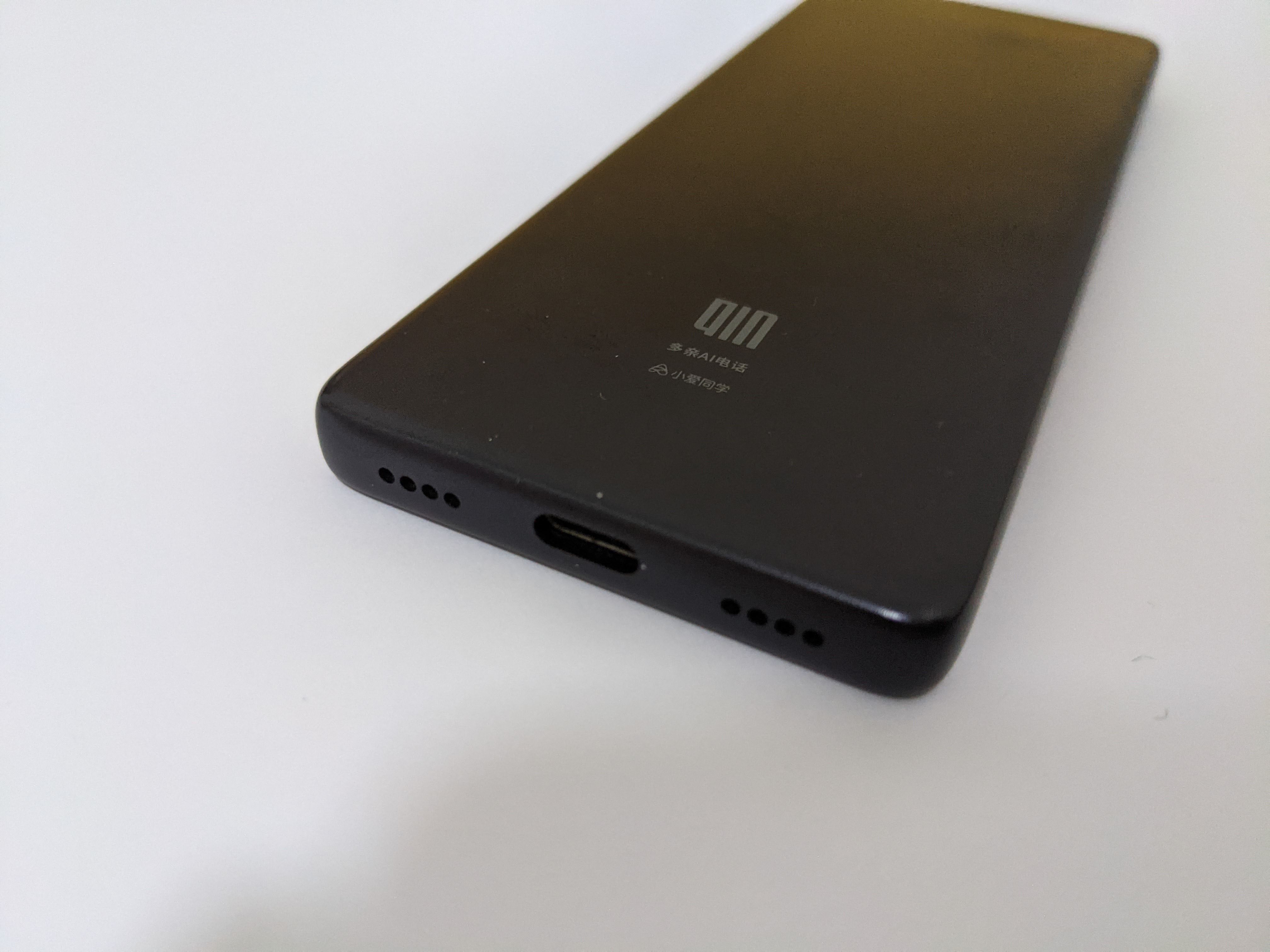 뒷면에는 아무것도 없이 Qin 로고와 AI를 강조하기 위한 多亲AI电话(뚜어친 AI전화), 小爱同学(샤오미에서 만든 샤오아이라는 음성인식 비서)라는 문구밖에 없다. 카메라는 탑재되있지 않다.