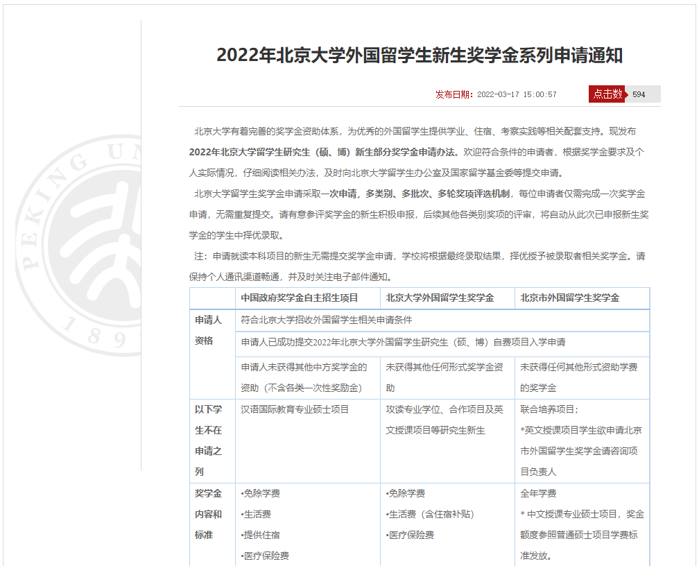 3월 17일, 그러니까 슬슬 각 학과 홈페이지에 면접 리스트가 공개될때쯤 북경대 유학생사무실 홈페이지에 석박사생 장학금 신청 공고가 올라왔다. 북경대를 통해 직접 신청하는 장학금은 중국정부장학금(B형), 북경대 유학생 장학금, 베이징시 유학생 장학금 총 3가지가 있다. 다만 칭화대와 다르게 중국정부장학금 A형에 대한 별도의 설명은 존재하지 않았다.
