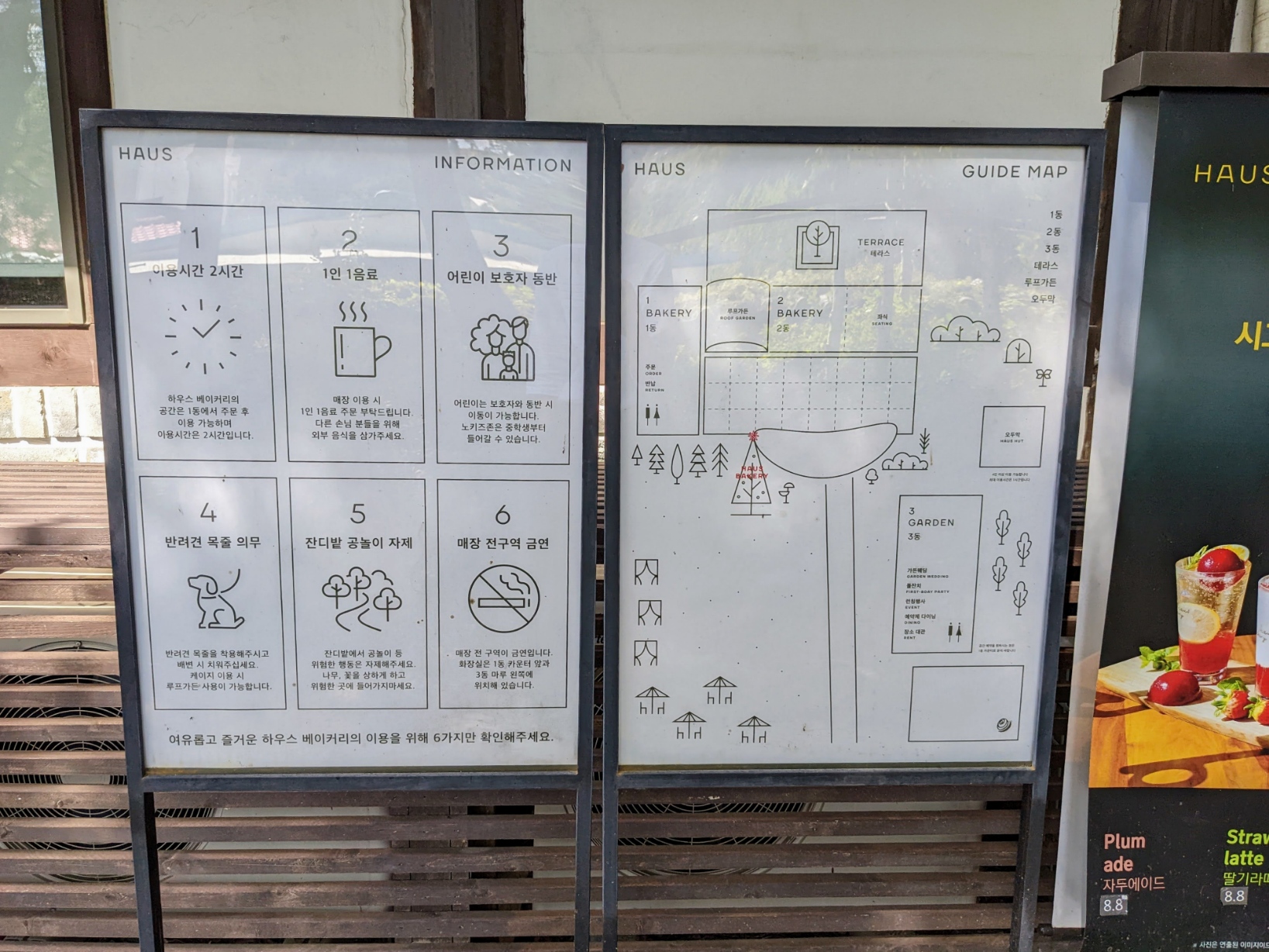 입구에 들어가면 카페 이용 관련 몇가지 주의사항과 카페 약도가 그려져 있다. 반려견은 목줄을 채우면 출입이 가능해서 반려견 키우는 사람들에게는 꽤 인기가 있는 곳인듯.