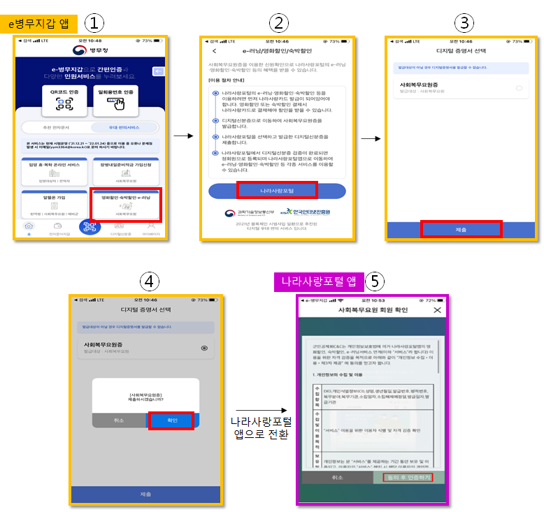 로그인 후 상단 군e-러닝 목록에서 학위강좌나 일반강좌를 눌러보면, "정회원 인증이 필요합니다"라는 팝업창이 뜬다. 이것때문에 "혹시 공익은 군이러닝도 못쓰나?" 싶겠지만, 공익은 e병무지갑, 나라사랑포털 앱 다운로드 후 아래 사진의 방법으로 인증하면 된다.