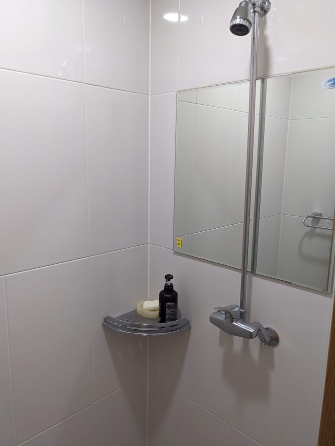 화장실과 샤워실의 모습. 깨끗하지만 굉장히 좁고 샤워기는 훈련소 샤워장처럼 고정되있는 형태라 좀 별로였다. 만약 숙소 내 화장실이 마음에 들지 않는다면 바깥에 있는 공중화장실을 사용해도 된다. 거긴 무려 비데까지 있음.
