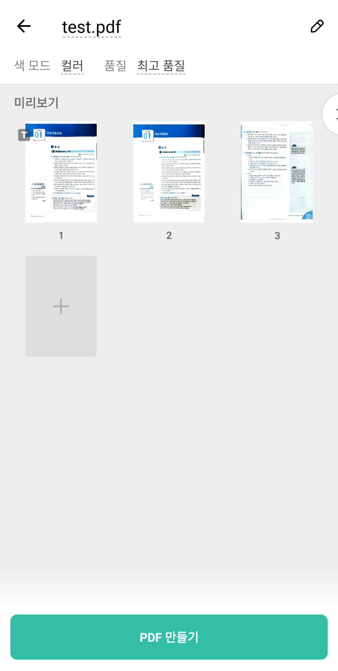 vFlat에서 책을 스캔한 모습. 두꺼운 자격증 수험서라 굴곡이 심하지만 어플에서 휘어진 부분을 제대로 인식해서 스캔 결과물에는 평평한 종이를 스캔한듯 왜곡이 거의 없다.