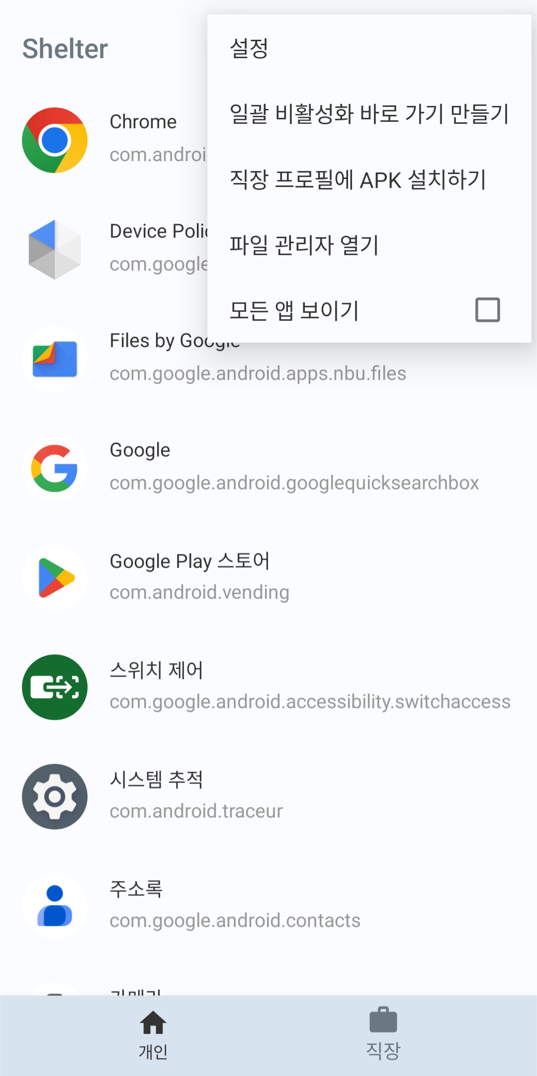 오른쪽 상단 점 세개를 눌러 설정에 들어간 다음, "프로필 간 파일 공유" 체크를 누른다. 그러면 Shelter에게 기기 관리자, 다른 앱 위에 표시 권한을 개인, 직장 양쪽 프로필 모두에게 부여하라는 알림이 나오며 설정으로 이동하게 되는데, 안내에 따라 권한을 설정해준다.