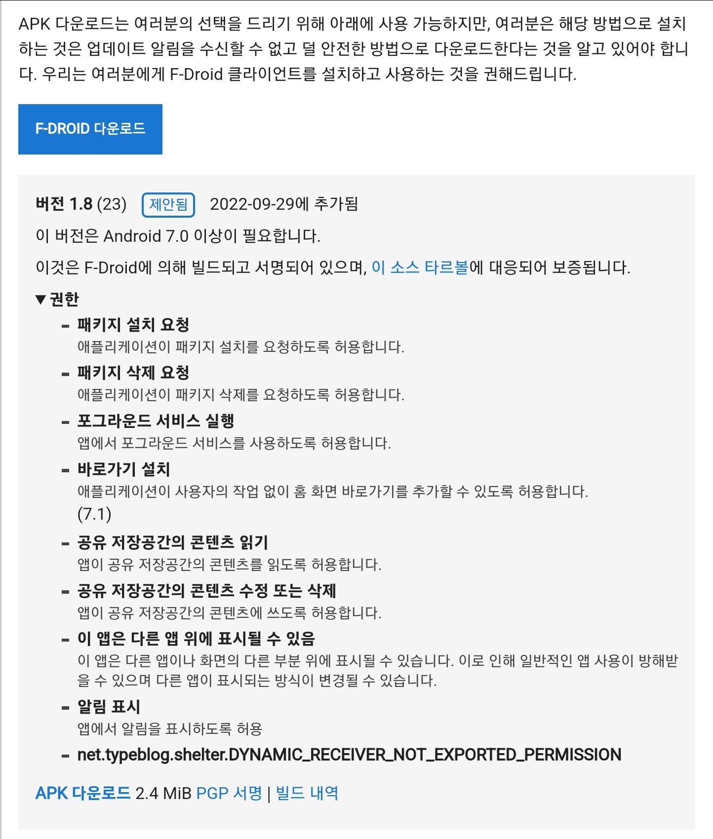 상단의 가장 눈에 띄는 "F-DROID 다운로드"를 눌러 클라이언트를 설치한 다음 이 앱을 다운받아도 되지만 어차피 이 앱은 업데이트가 1년에 한 번 있는 수준이므로 업데이트 알림 수신은 의미가 없으니, 밑에 "APK 다운로드"를 눌러 페이지에서 바로 설치 파일을 다운받는걸 추천한다.
