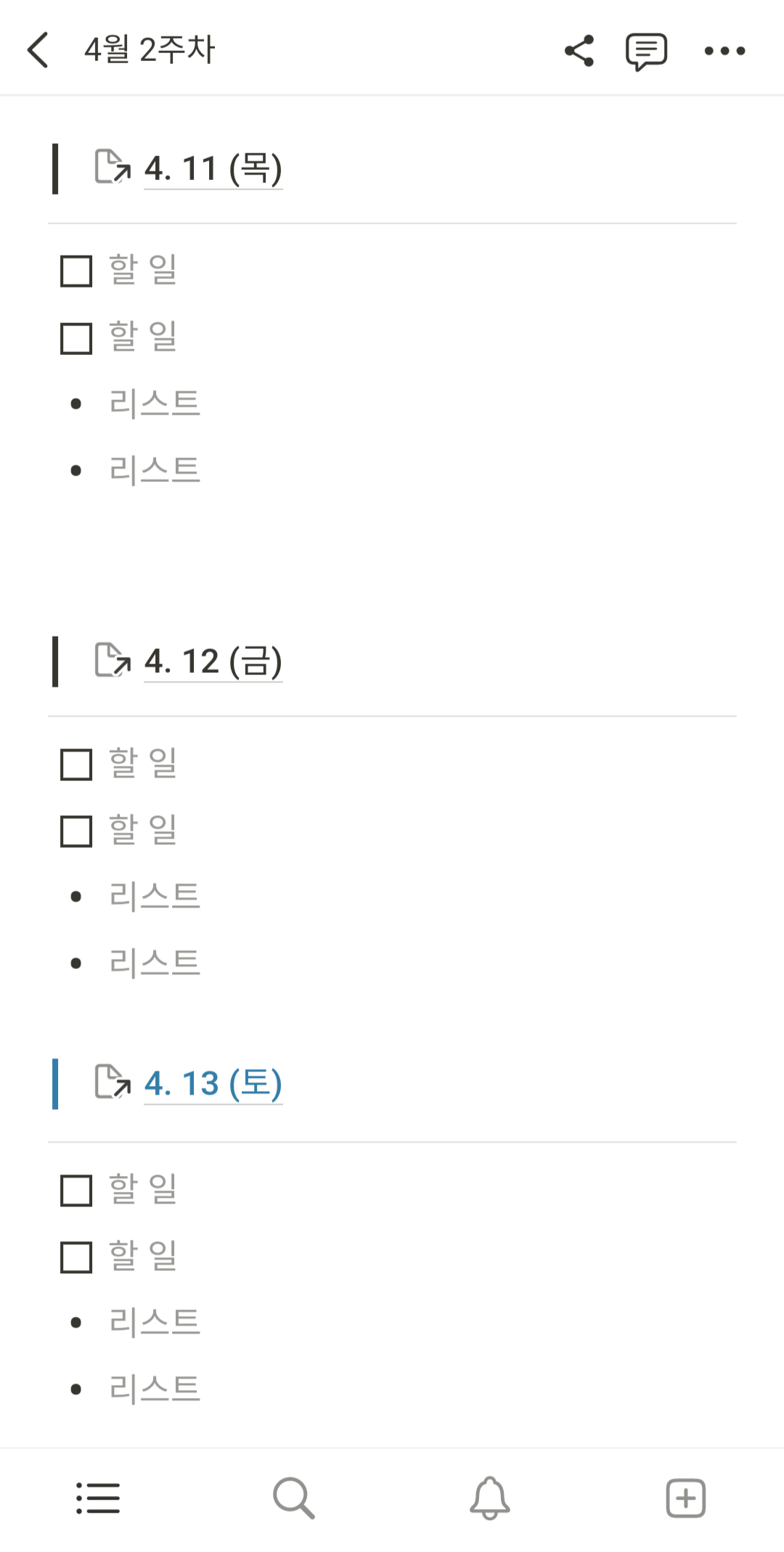 - 데일리 플래너에는 별도의 템플릿을 제공하지 않습니다. 자신의 습관에 맞게 자유롭게 매일 일기를 작성하시거나, 데이터베이스 템플릿을 통해 자신에게 맞는 일기 양식을 직접 제작하여 사용해보세요!