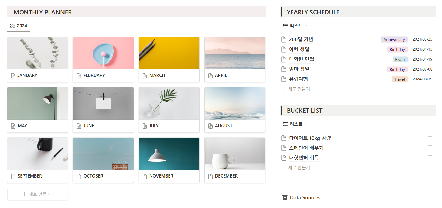 - 버킷 리스트: 새해에 달성하고 싶은 목표나 다짐을 기록하는 곳입니다. 플래너를 열때마다 확인하면서 올해에는 작심삼일 탈출을 향해 노력해보세요! (만약 "달성"의 기준이 애매하다면 체크리스트 속성을 삭제해서 사용하시면 됩니다.)
