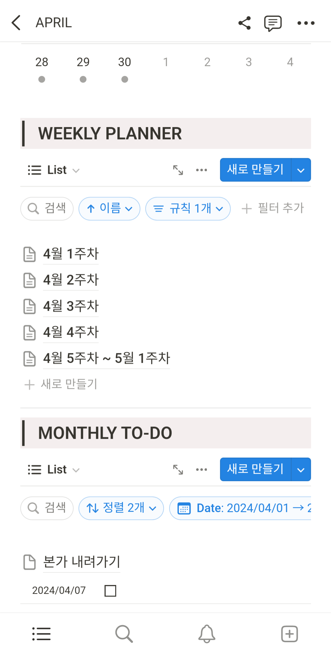 - 월간 투두리스트: 월별 중요한 일정을 기록하는 곳입니다. 달력과 마찬가지로 "데이터 소스" 내 먼슬리 투두 데이터베이스에 링크 후 당월 항목들만 표시되도록 필터링한 방식이므로, 만약 일정이 미뤄졌다면 번거롭게 삭제 후 새로 만들 필요 없이 날짜만 바꿔주면 자동으로 해당 월 페이지로 이동됩니다.