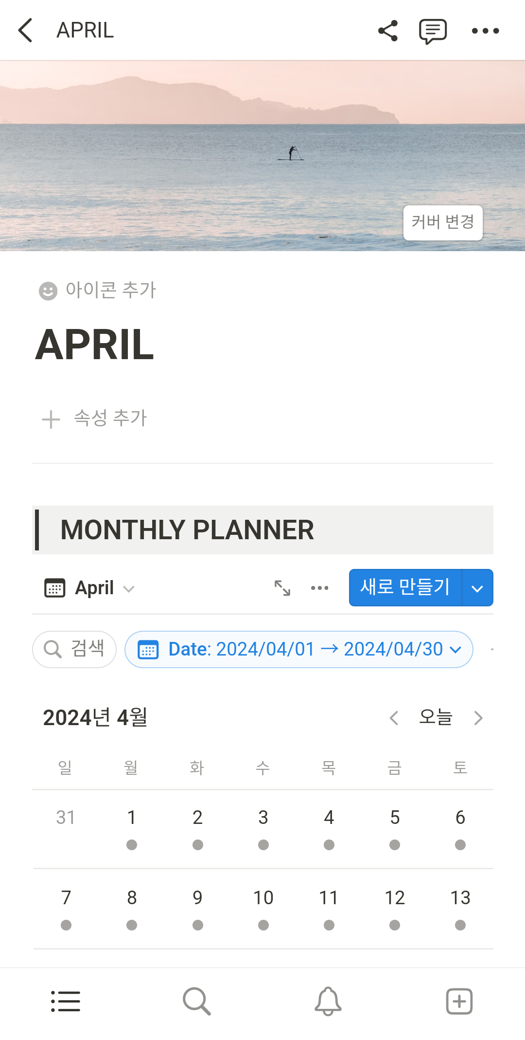 - 템플릿 적용 후 먼슬리 플래너를 열어보시면 캘린더가 자동으로 해당 월을 표시하는게 아닌 이번 달에 열려있을겁니다. 이는 캘린더 데이터베이스가 포함된 페이지를 열 때 몇 월이 나오게 할지 고정이 불가능하는 노션의 태생적 한계로 인한 문제이므로, 번거롭겠지만 수동으로 넘겨서 사용하시기 바랍니다.