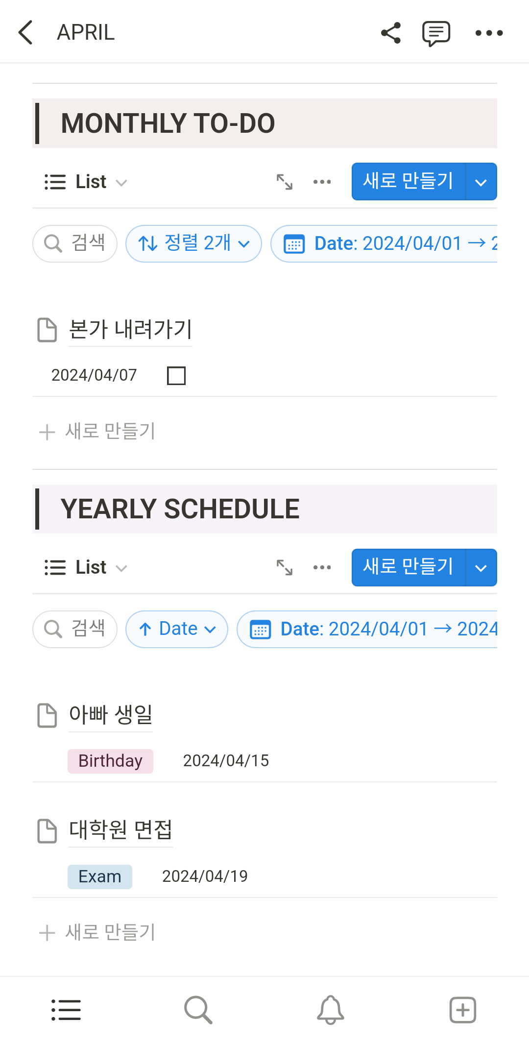 - 연간 일정: 메인 화면에 있던 연간 일정 데이터베이스와 연결되어, 당월 일정만 표시되도록 필터가 설정되있는 데이터베이스입니다. 월간 투두와 마찬가지로 날짜만 바꿔주면 자동으로 해당 월 페이지로 넘어갑니다.