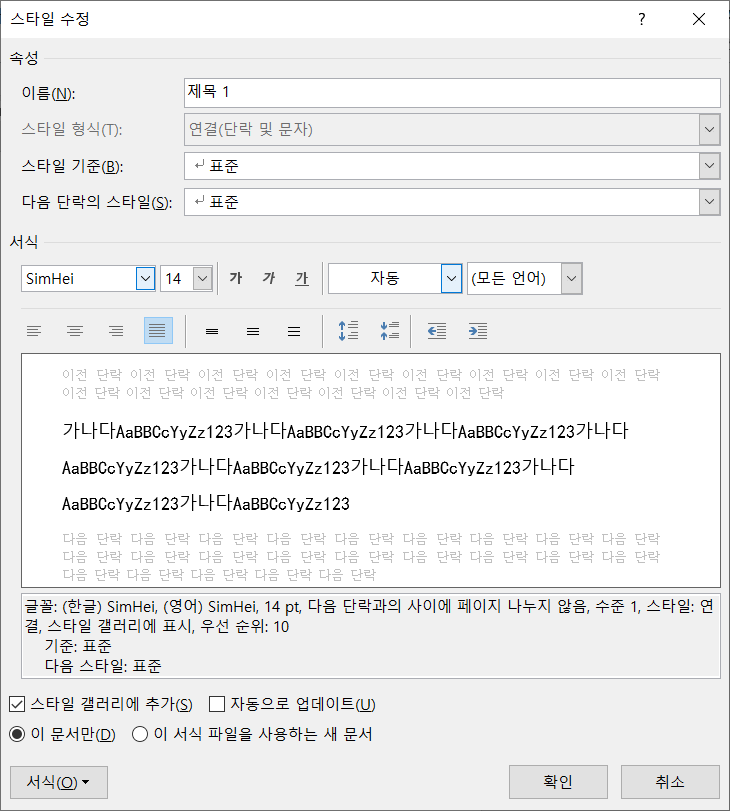 이렇게 논문 양식에 맞게 수정해두면 나중에 클릭 한 번으로 글꼴과 크기를 변경할 수 있다.