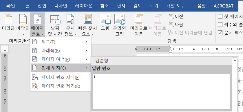 기본적으로 내장된 바닥글에 제공하는 페이지들은 죄다 디자인이 조잡한 것들밖에 없어서 그냥 바닥글 선택한 상태에서 페이지 번호-현재 위치-일반 번호를 눌러 페이지 번호를 삽입하는 걸 추천한다.