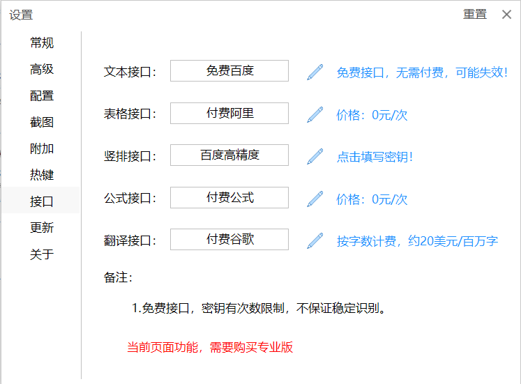 바이두의 무료 OCR API를 사용하는 Tianruo OCR의 일반 문구 인식 기능은 아직까진 완전히 무료이다. 하지만 표 인식, 세로쓰기 인식, 공식(무려 LaTeX로 복사를 지원한다 카더라) 인식, 자동 번역 기능은 따로 API를 구매해야한다. 언제 프로그램이 망할지 몰라서 아직까지는 그냥 무료 기능으로 잘 사용하는중.