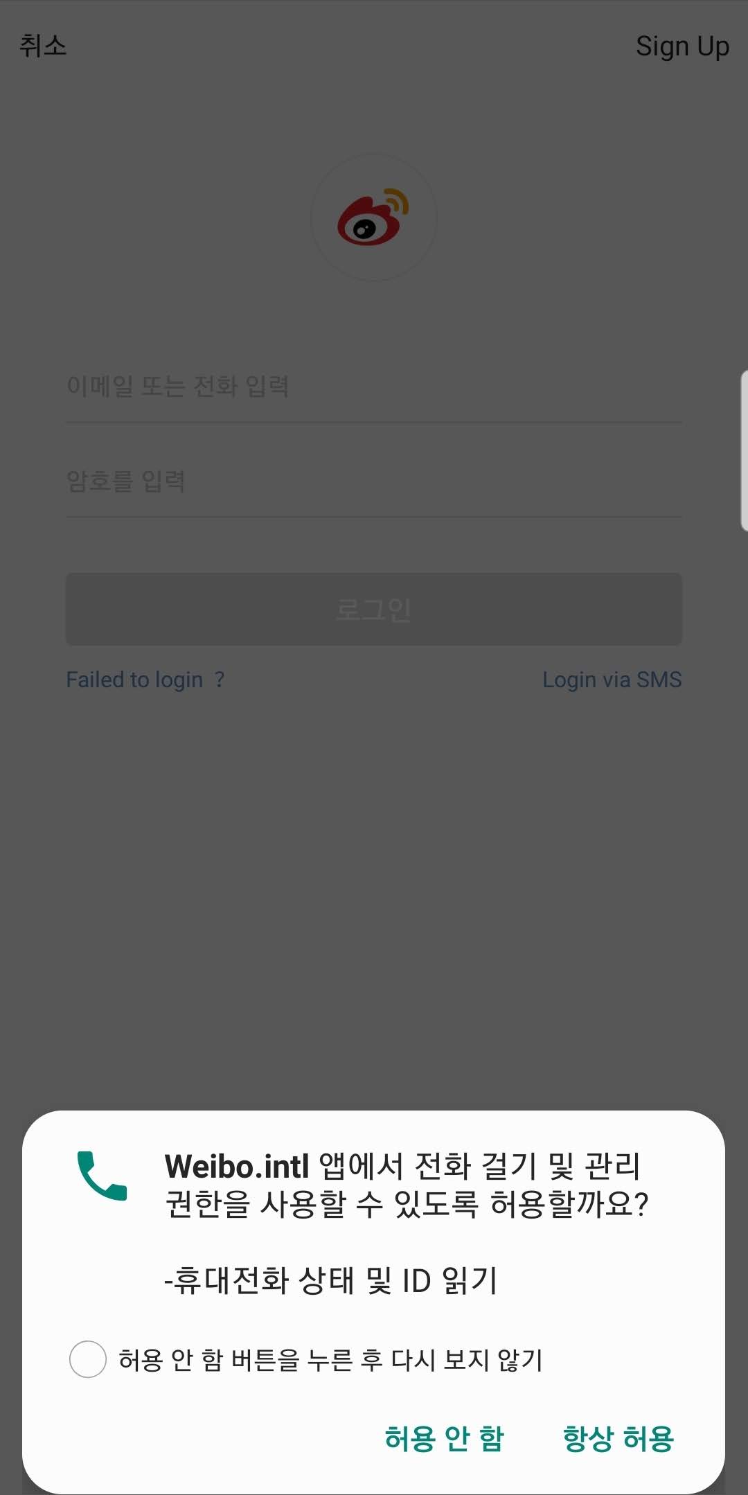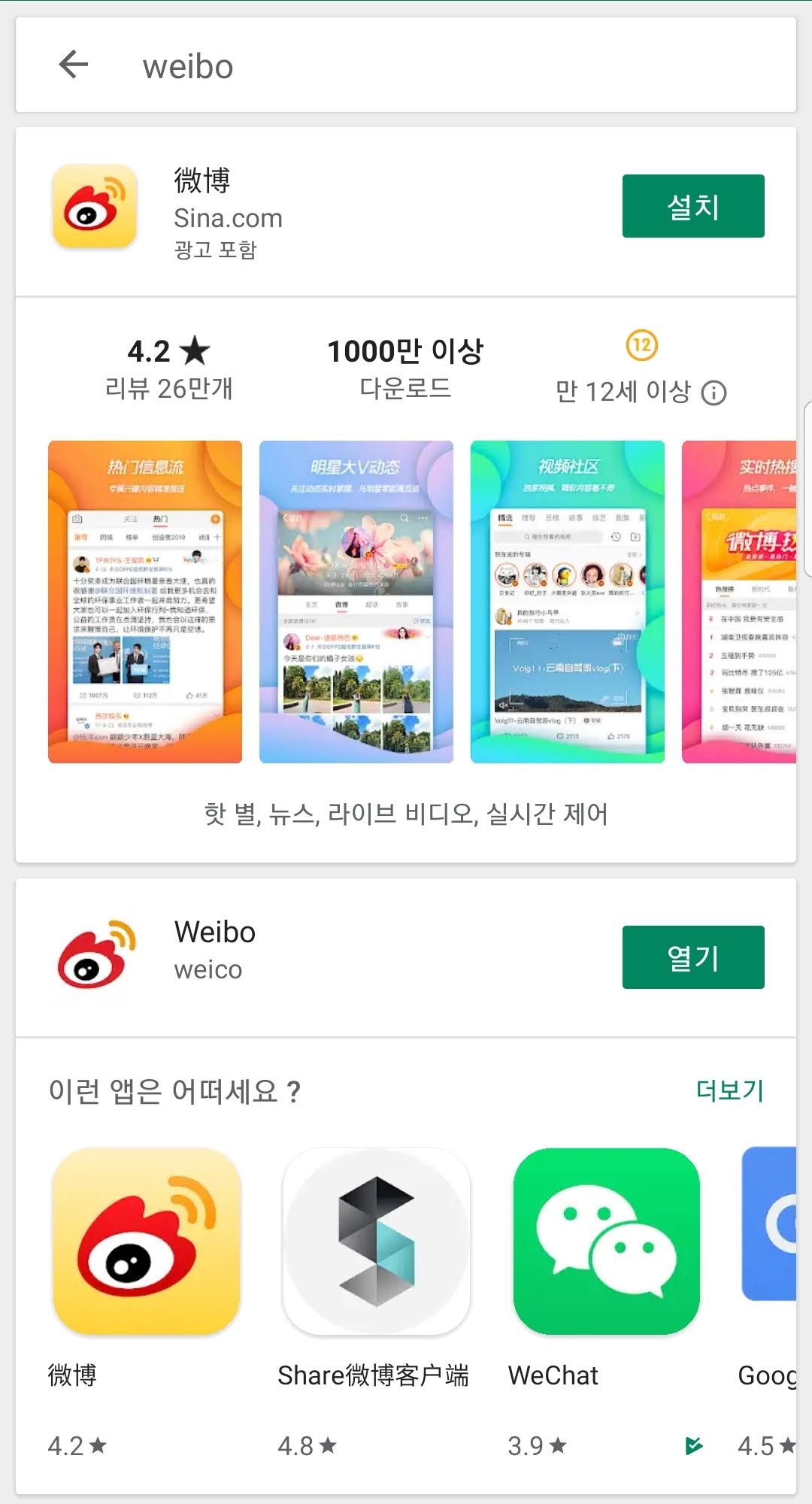 구글플레이에 weibo라고 검색하면 微博가 나오고 Weibo가 나오는데 후자를 다운받는걸 극구 권장한다.