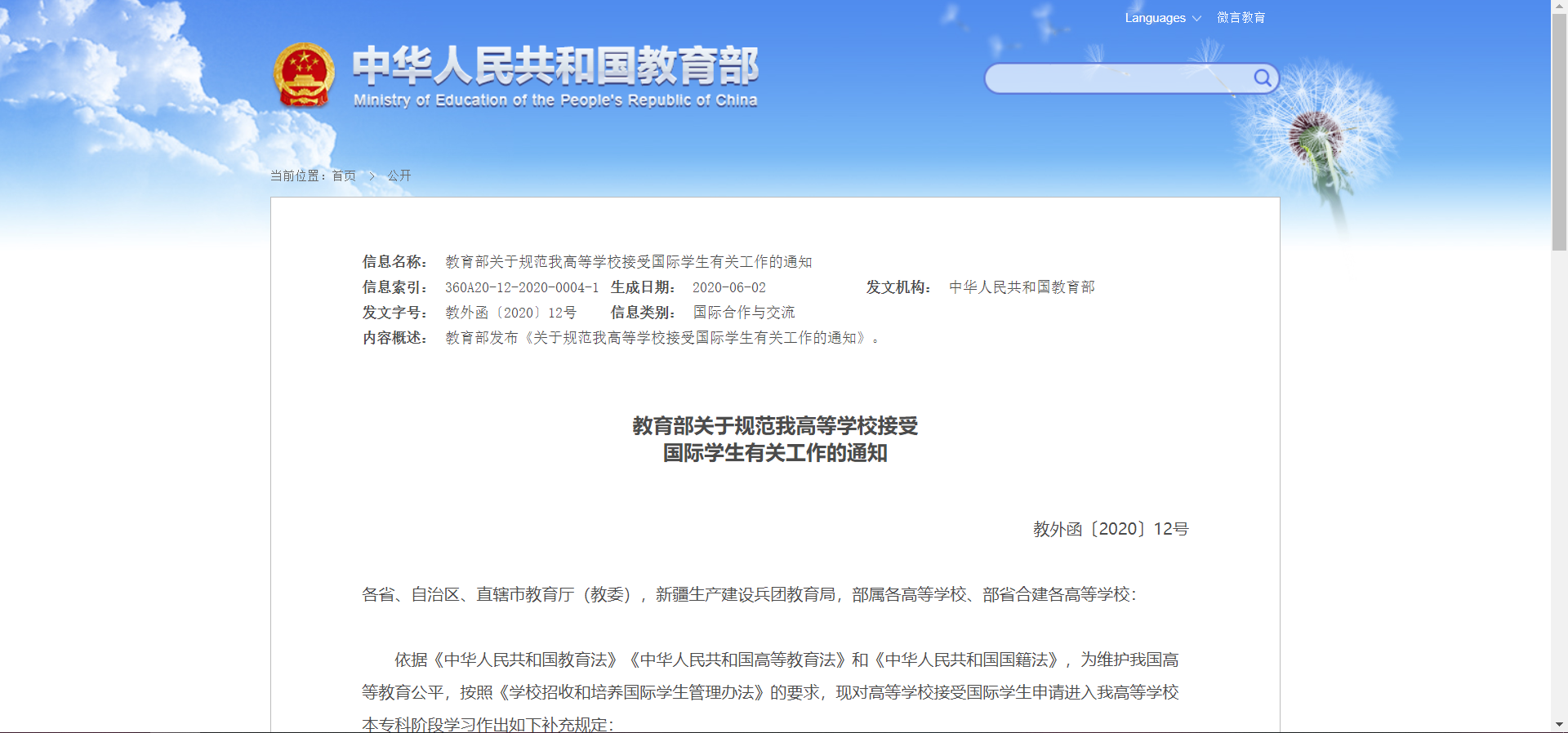 信息公开_部函 教育部关于规范我高等学校接受国际学生有关工作的通知 教外函〔2020〕12号 各省、自治区、直辖市教育厅(教委),新疆生产建设兵团教育局,部属各高等学校、部省合建各高等