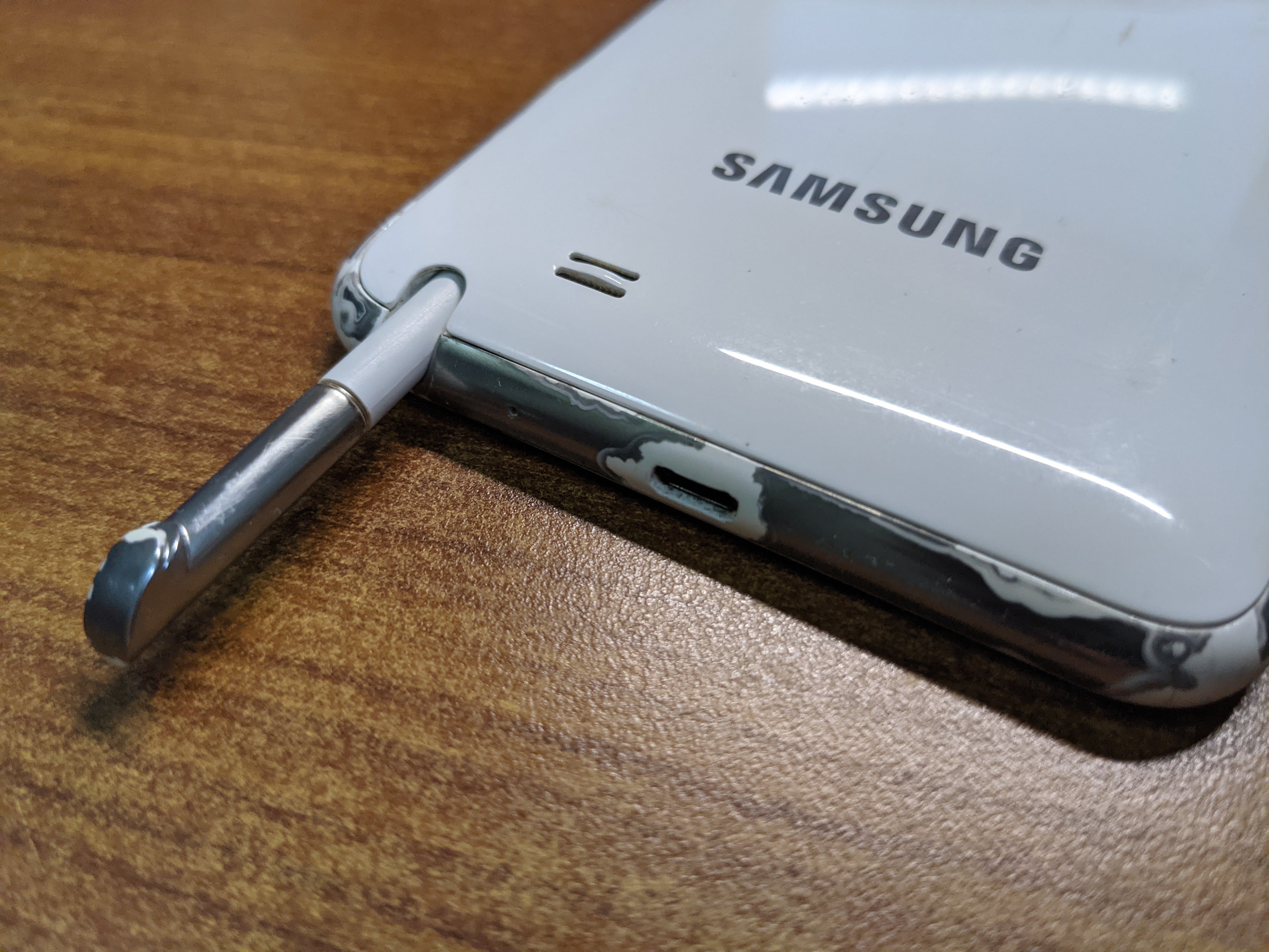 하단에는 마이크로 5핀 USB 단자와 그 유명한 S펜이 있다. 요즘 S펜처럼 한번 누르면 튕겨져 나오는 방식은 노트5부터 사용되었고, 그 이전에는 손톱으로 뽑는 방식이었다. 그래서 오래 쓰다 보면 조금 헐거워짐.