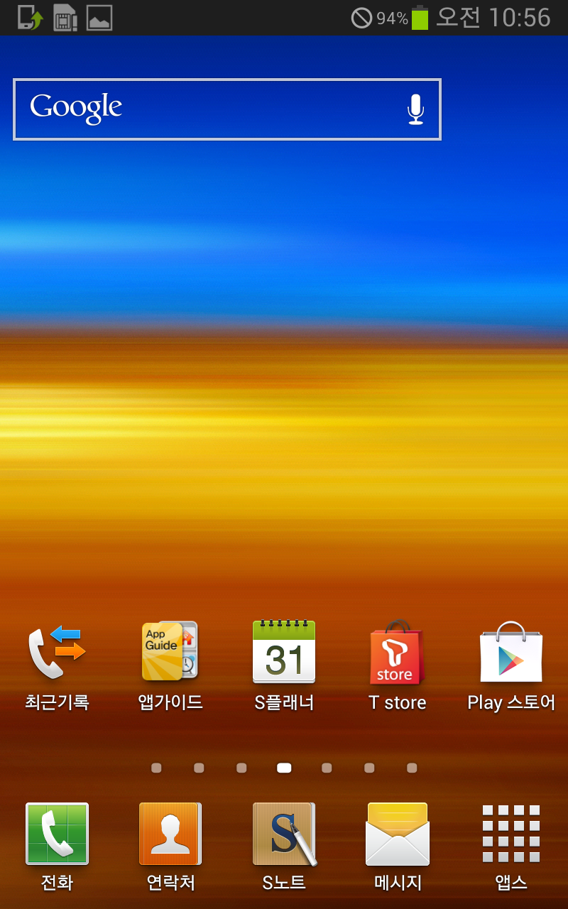 당시 스마트폰 UI의 아이콘 배열은 4열 배열이 일반적이었지만 갤럭시노트1은 화면이 광활하다 보니 5열로 배열돼있다. 뭐 지금은 흔하지만 당시에는 5열 배열이 얼마나 생소했는지 구글 검색창마저 화면 크기에 맞지 않는 모습이다.