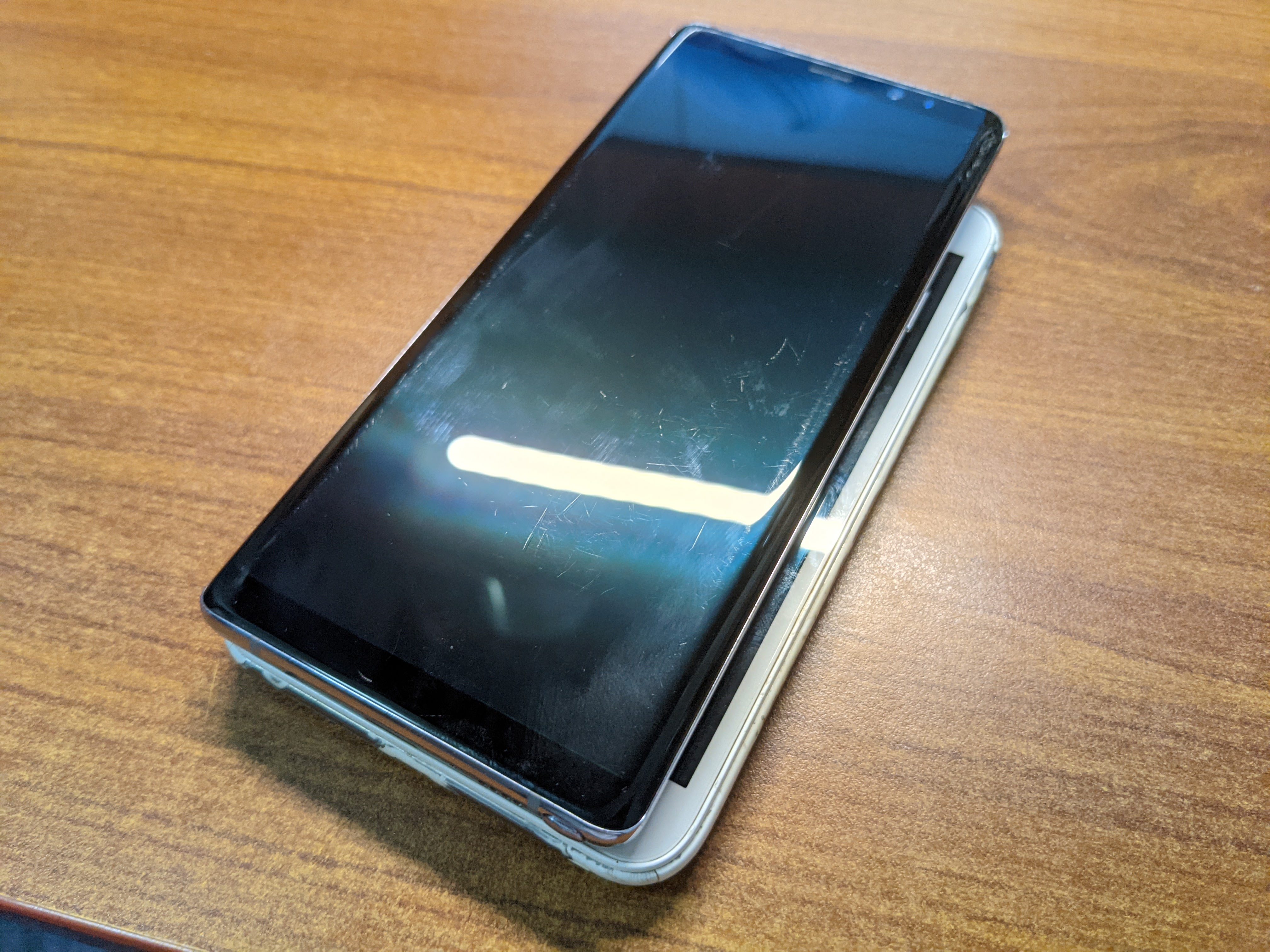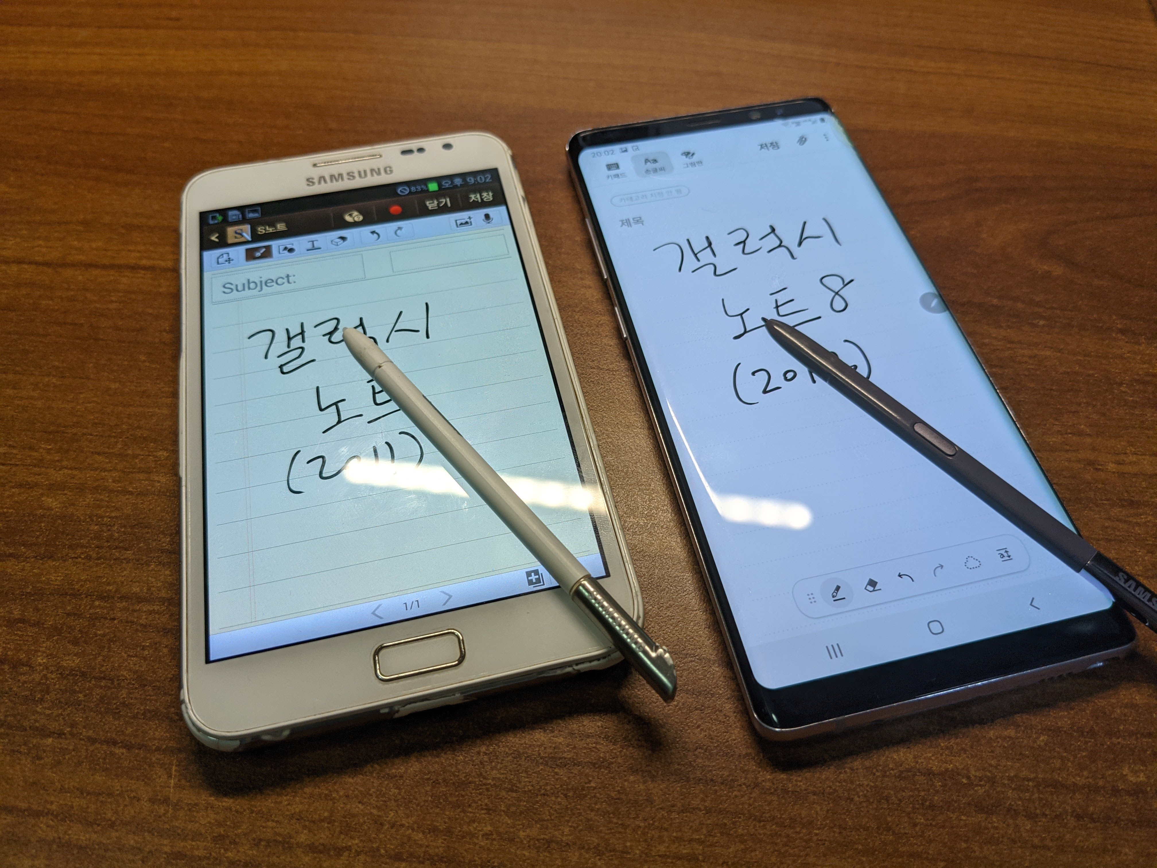 갤럭시 노트 8과의 크기 비교. 노트1은 5.3인치, 노트8은 6.3인치로 화면 크기만 비교했을 땐 노트 8의 화면이 더 크지만 더 길쭉해진 화면 비율과 얇아진 베젤로 인해 오히려 노트3의 폭이 더 크다.