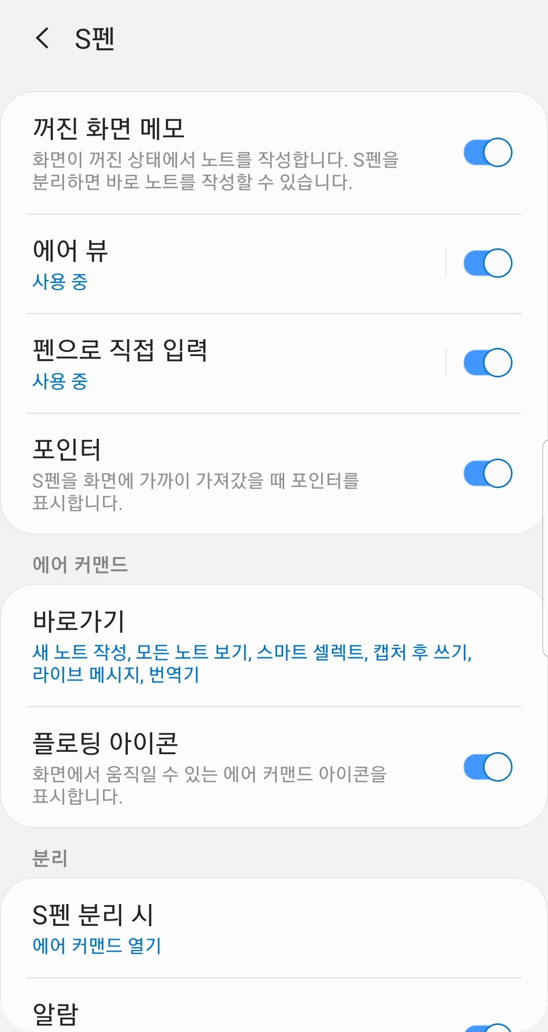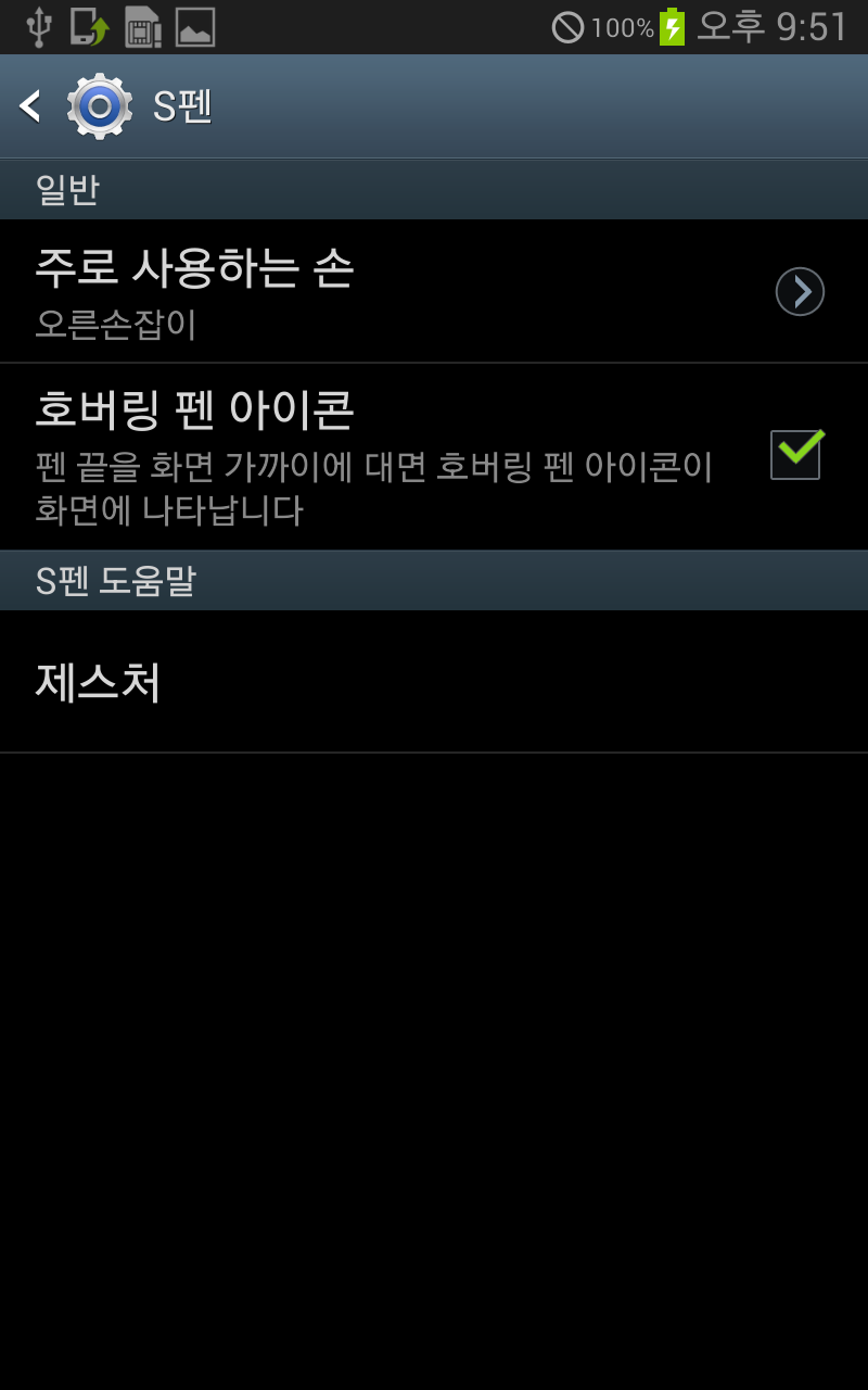 왼쪽 사진은 노트1의 S펜 관련 옵션, 오른쪽은 노트 8의 옵션인데, 아무래도 초기 노트 시리즈 제품이다 보니 S펜 관련 기능이 굉장히... 간단해 보인다. 주로 사용하는 손 (왼손, 오른손의 미세한 각도 차이 때문에) 설정, 호버링 아이콘 표시와 제스처 안내가 끝. 에어 커맨드라던가 S펜 분리 인식이라던가는 모두 노트1 이후에 등장한 기능들.