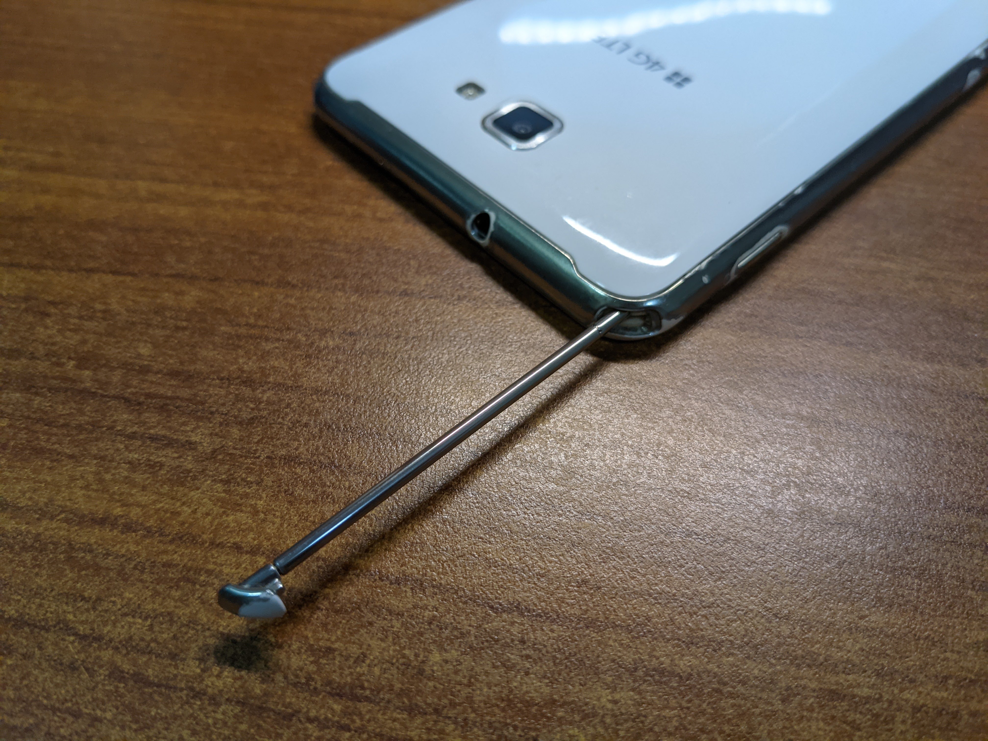 하단에는 마이크로 5핀 USB 단자와 그 유명한 S펜이 있다. 요즘 S펜처럼 한번 누르면 튕겨져 나오는 방식은 노트5부터 사용되었고, 그 이전에는 손톱으로 뽑는 방식이었다. 그래서 오래 쓰다 보면 조금 헐거워짐.