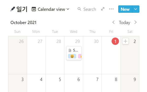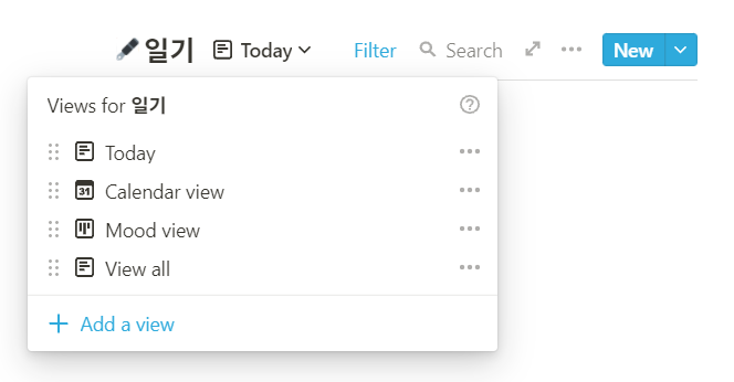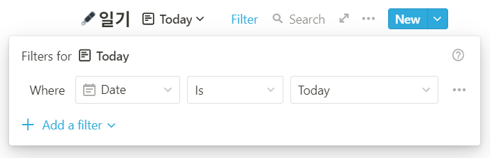 오늘 일기만 보기는 즉, 필터 기능을 통해서 "오늘" 작성된 글만 표시된다. 한눈에 오늘 일기를 썼는지 안 썼는지 알 수 있어서 편리할 뿐만 아니라 "일기 부분이 텅 비어있음=오늘 일기 아직 안씀=얼른 일기 써야지" 이라는 동기부여도 된다. 이 부분은 Jeremy님의 다이어리 템플릿을 참고하였다.