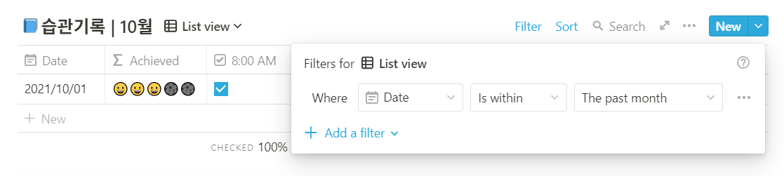이번달 모든 날짜가 한번에 나와버리면 사용하기 불편하므로 평소에는 필터 기능을 활용하여 최근 1달 이내 (즉 실제로는 매달 1일~오늘) 습관 기록만 표시되도록 설정해놓고 사용한다. (글 작성 당시에는 10월 1일이었으므로 딱 하루만 저렇게 떠있다.)