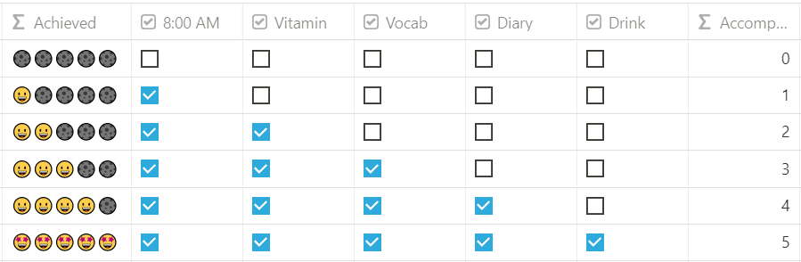 단순히 할 일을 몇 개 달성했는지 숫자로만 보여주면 재미가 없으니 숫자에 따라 다른 방식으로 표시하는 공식란도 만들었다. 나처럼 emoji를 활용하여 로딩바처럼 만들어도 되고, 격려 멘트를 적어도 되고 본인 입맛에 따라 변경하면 된다.