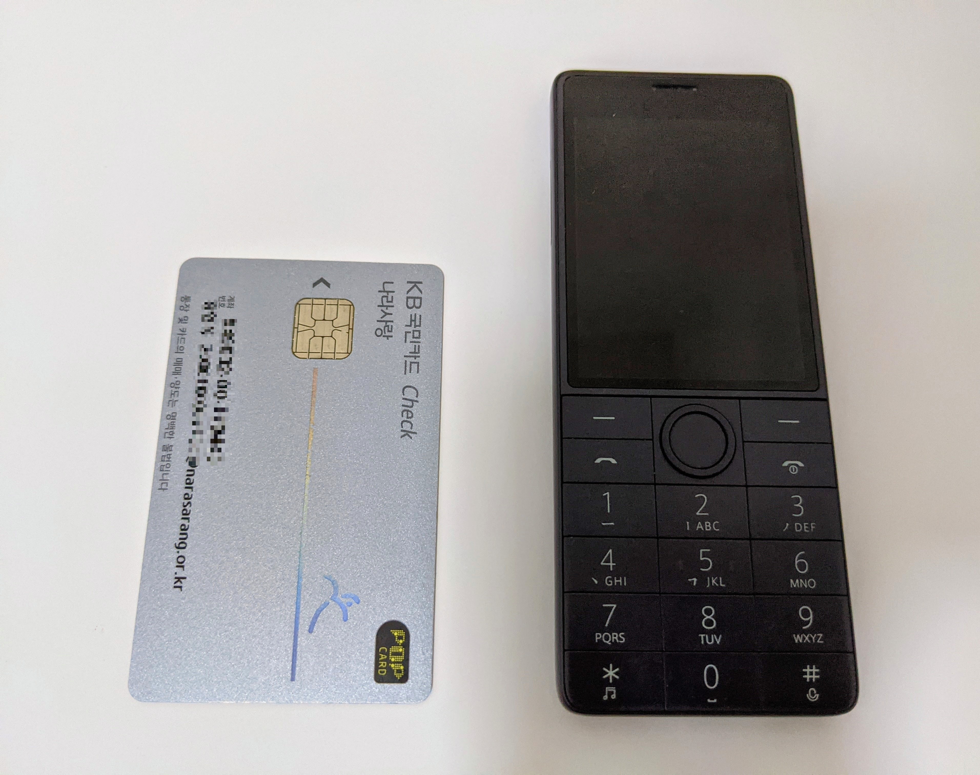 체크카드와 크기 비교. 폭은 거의 체크카드의 너비와 비슷한 수준으로 한손에 충분히 들어오고도 남는 아담한 사이즈며, 무게 역시 묵직함이라곤 전혀 느껴지지 않고, 주머니에 넣어도 알아채기 힘들 정도로 가볍다. 평소에 휴대폰만 들고 가볍게 외출할때 메인폰이랑 같이 들고 나가도 전혀 부담이 되지 않는다.