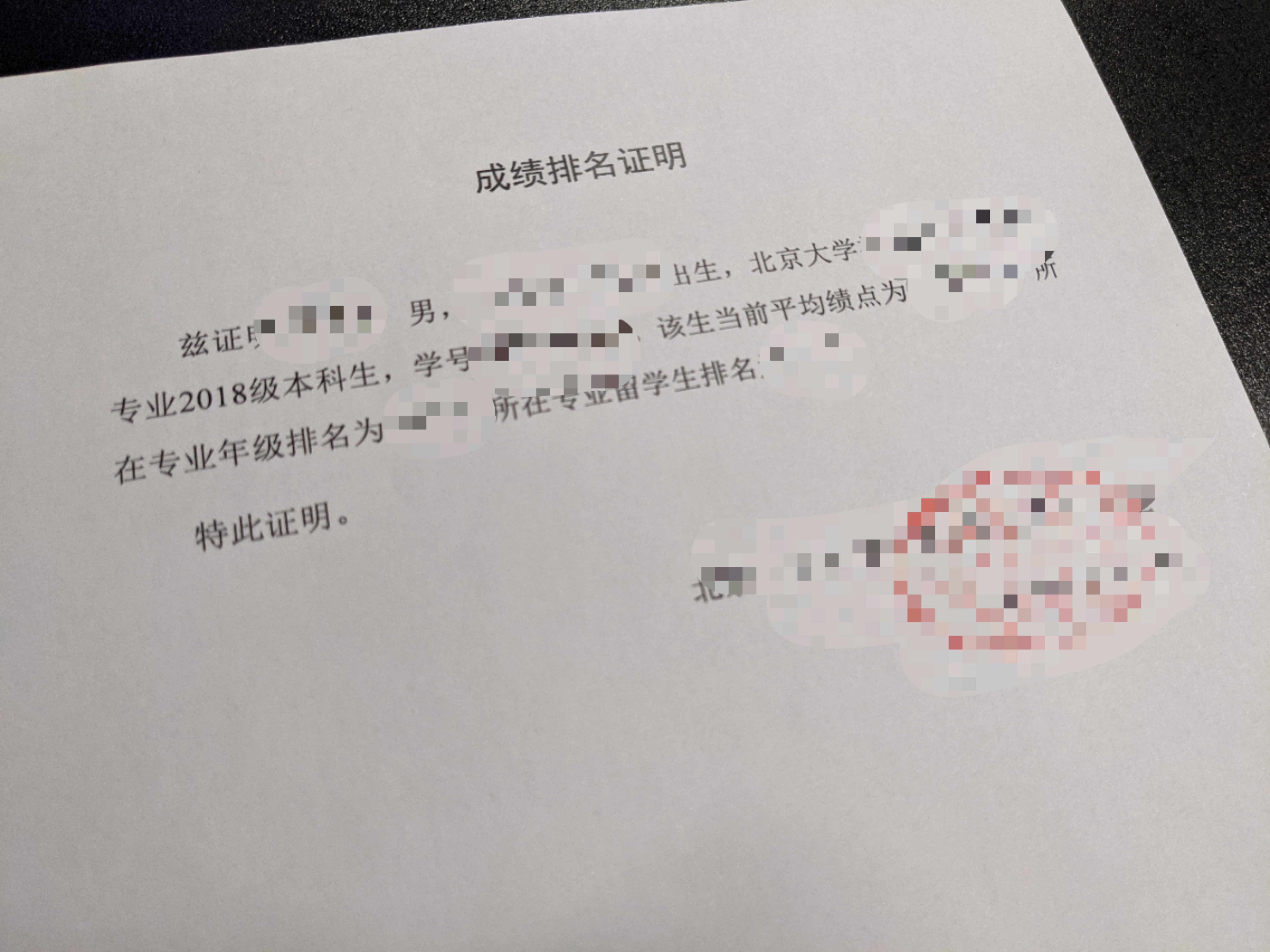 칭화대의 자기소개서 양식에는 기존 GPA와 4점제 변환 후 GPA, 그리고 성적 순위를 작성하라는 란이 있는데, 다른 대학은 어떤지 모르겠으나 북경대의 성적증명서(Transcript)에는 100점제 성적만 쫘르르 나열되있고 학년 내 성적 순위는 물론 4점제 GPA와 계산법이 적혀있지 않다. 나중에 혹시 공식 증명을 학교 측에서 요구할 수도 있고, 성적 순위도 몇 위인지 알아볼 겸 학과 교무처에서 GPA와 성적 순위 증명서를 떼왔다.