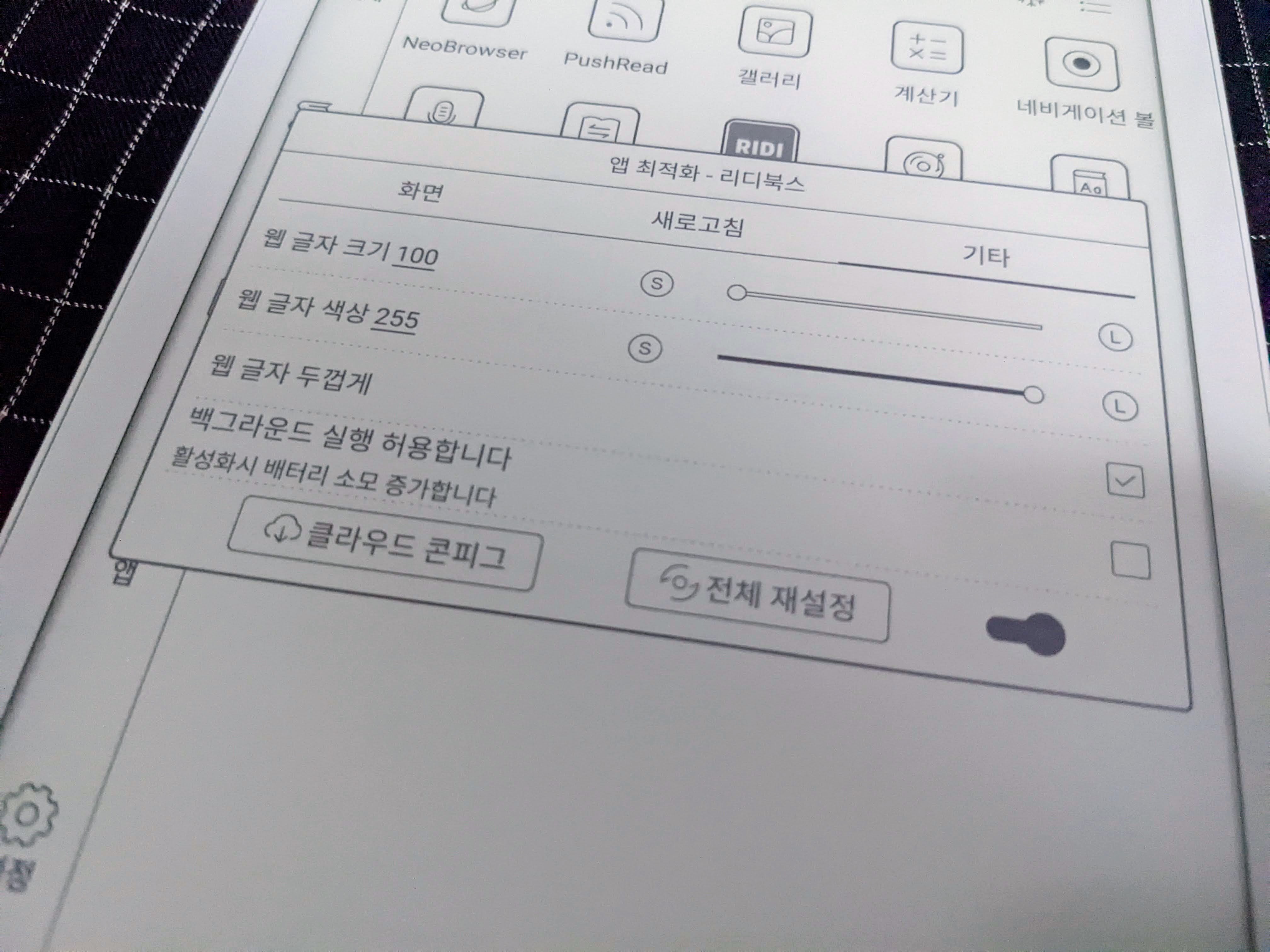 오닉스 북스 제품의 특징 (다른 이북리더에도 있나?) 으로 "서드파티 앱 최적화" 기능이 있다. 홈 런처에서 앱 아이콘을 꾹 눌러 "최적화"로 들어가면, 앱 DPI, 배경화면 하얗게, 글씨체 크기와 색상 등 e잉크 화면에서 "그나마" 잘 보이게 세세한 커스터마이징이 가능하다.