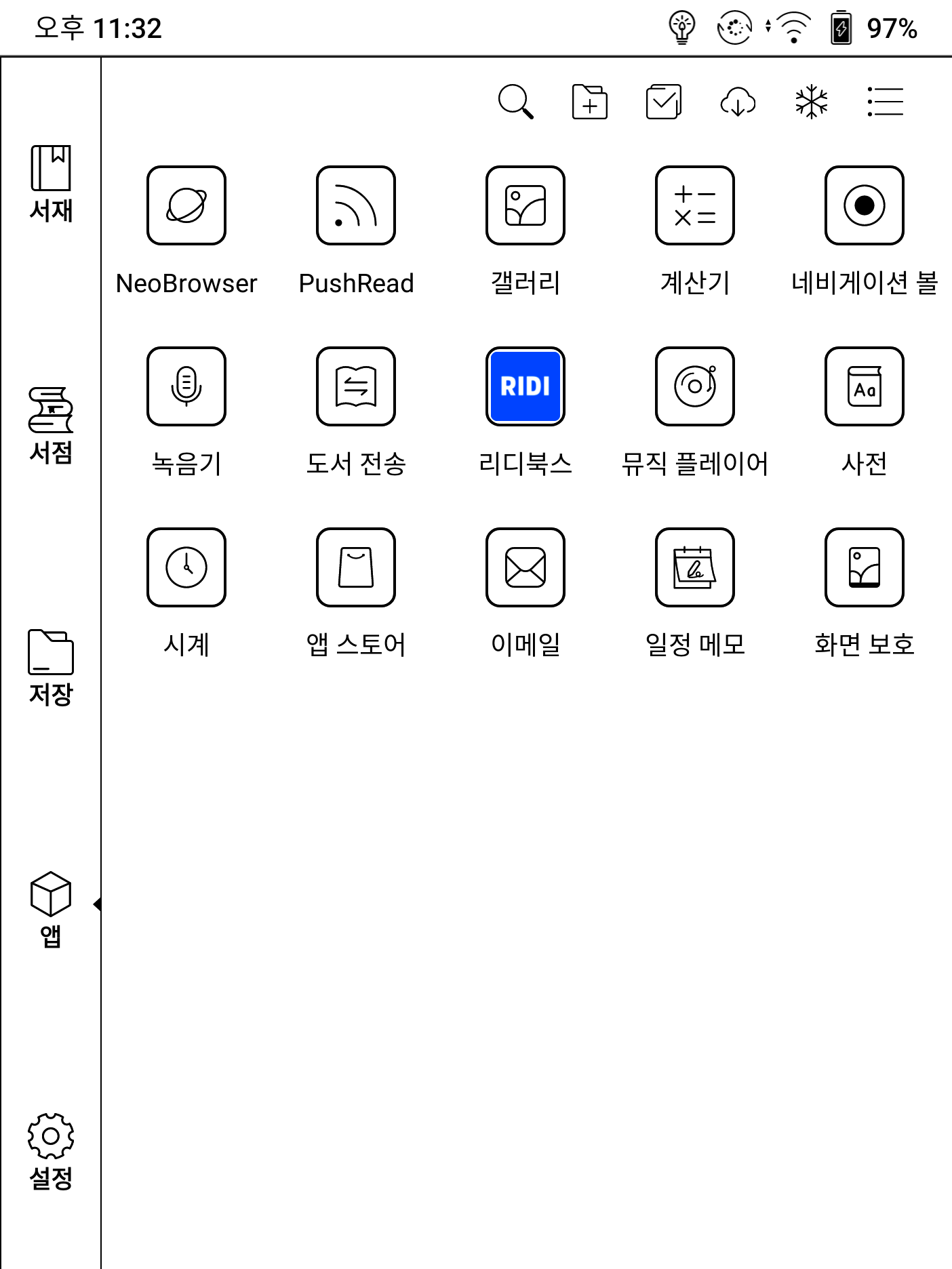 안드로이드 10 버전 기반으로 구동하기 때문에 킨들, 리디북스, 교보문고 등 서드파디 전자책 앱은 물론이고, 뉴스리더같은 e잉크에서 사용하면 적합한 앱이라면 모두 설치가 가능하다. (뭐 안드로이드 제품이니 게임을 설치하고 유튜브를 설치해도 이론상 되긴 하는데... 그렇게 쓰는 사람은 거의 없을듯.)