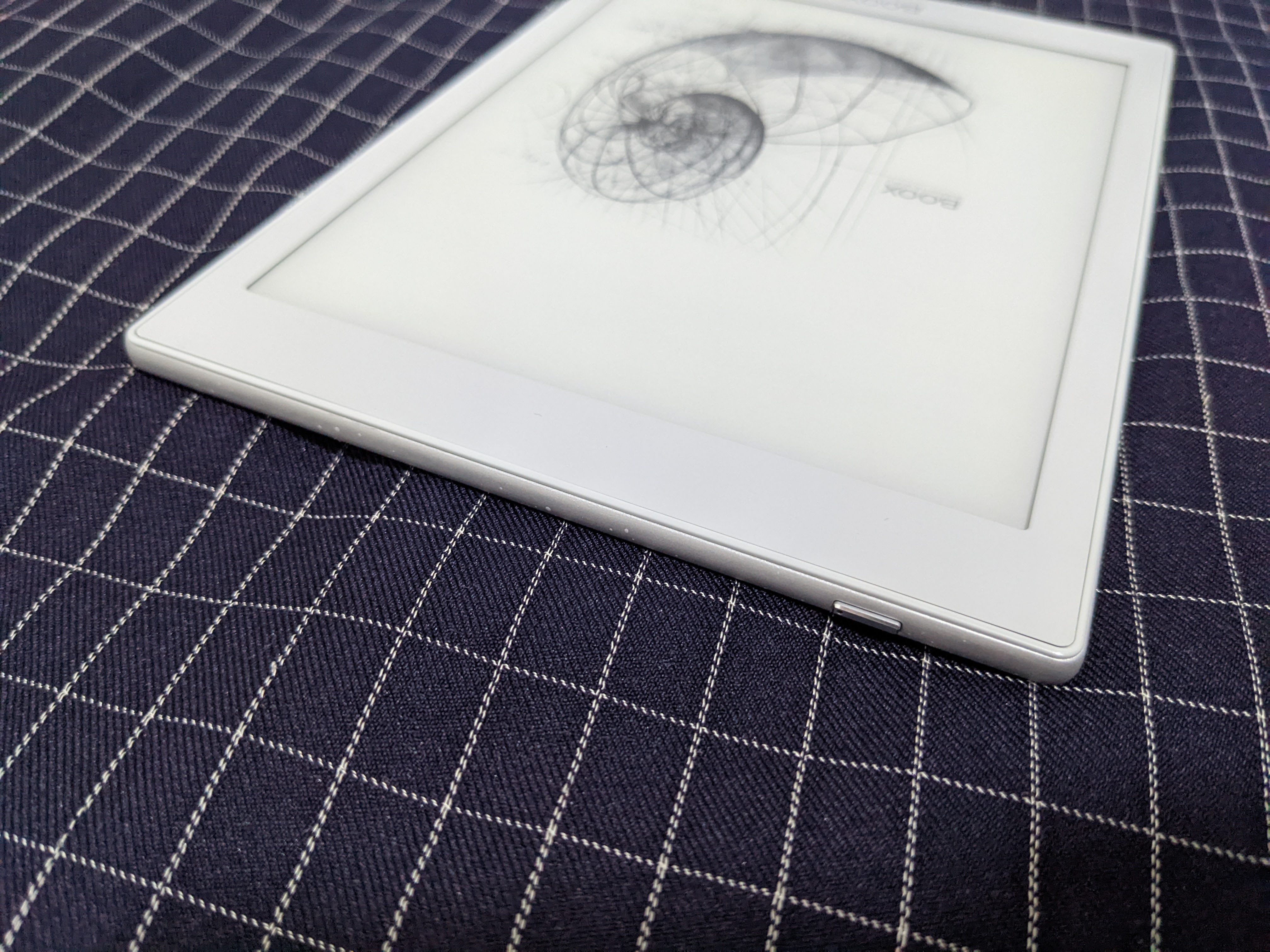 사진으로 보면 화면이 안쪽으로 들어가서 설마 노트10.3처럼 움푹 파인곳에 먼지가 끼는게 아닌가 싶지만, 실은 강화유리가 장착된 플랫 디스플레이다. 라미네이팅 처리가 안된 아이패드 기본형 모델을 생각하면 쉽다. (e잉크는 기술적으로 라미네이팅이 불가능한가?)