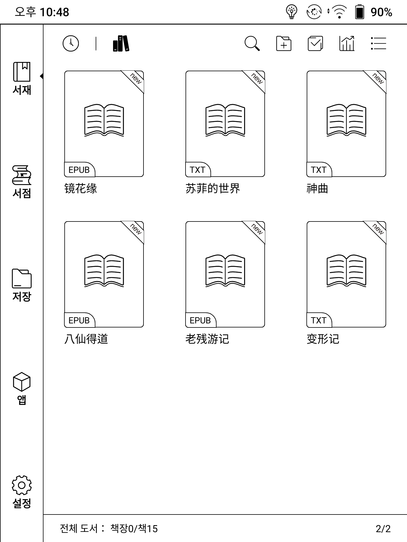 홈 런처의 기본 첫 화면인 "서재" 화면. 파일 위치와 상관없이 디바이스에 저장되있는 txt, epub, azw3, mobi 등 전자책 형식의 파일을 모아서 보여준다.