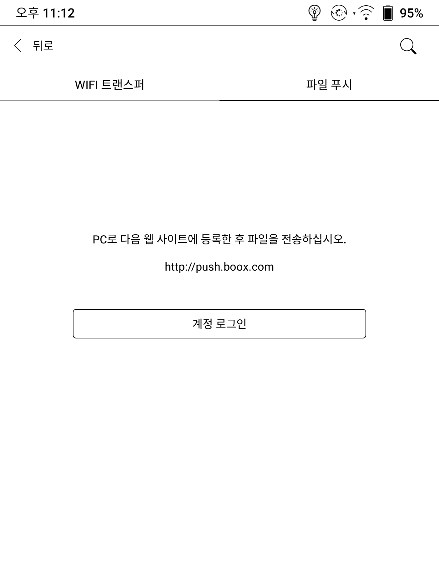 컴퓨터나 스마트폰에서 https://push.boox.com에 들어가서 이메일이나 휴대폰 번호로 로그인하고 (특이하게 매번 로그인 할때마다 인증 코드를 수신하는 방식이라 따로 회원가입하는 기능이 존재하지 않는다.), 노바 에어S에 같은 계정으로 로그인한 다음 브라우저에서 전송할 파일을 업로드하면 끝이다.