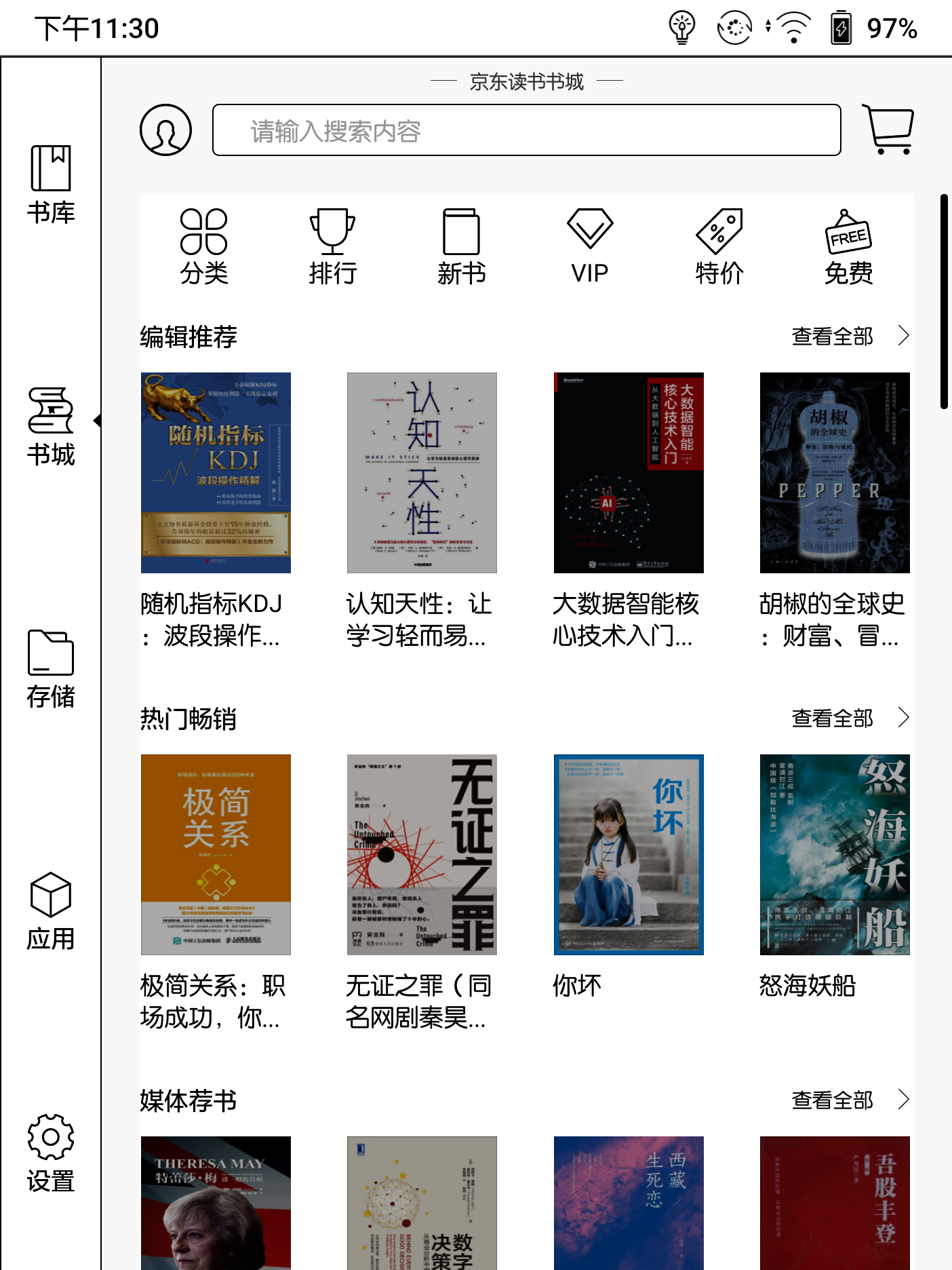 안드로이드 10 버전 기반으로 구동하기 때문에 킨들, 리디북스, 교보문고 등 서드파디 전자책 앱은 물론이고, 뉴스리더같은 e잉크에서 사용하면 적합한 앱이라면 모두 설치가 가능하다. (뭐 안드로이드 제품이니 게임을 설치하고 유튜브를 설치해도 이론상 되긴 하는데... 그렇게 쓰는 사람은 거의 없을듯.)