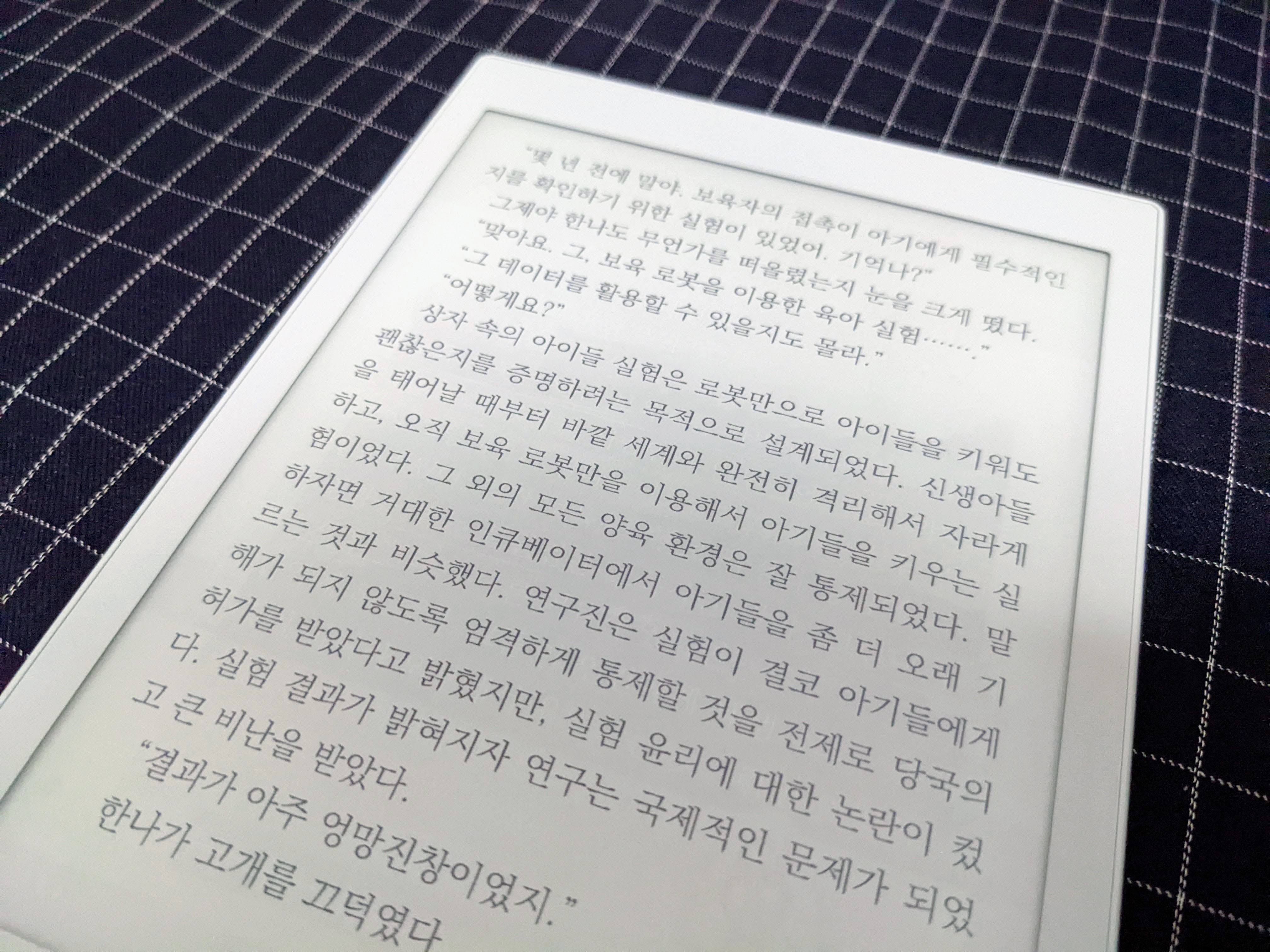 디스플레이를 살펴보자. 화질이야 뭐 300ppi로 한눈에 봤을때 종이와 별반 다를바가 느껴지지 않는다.