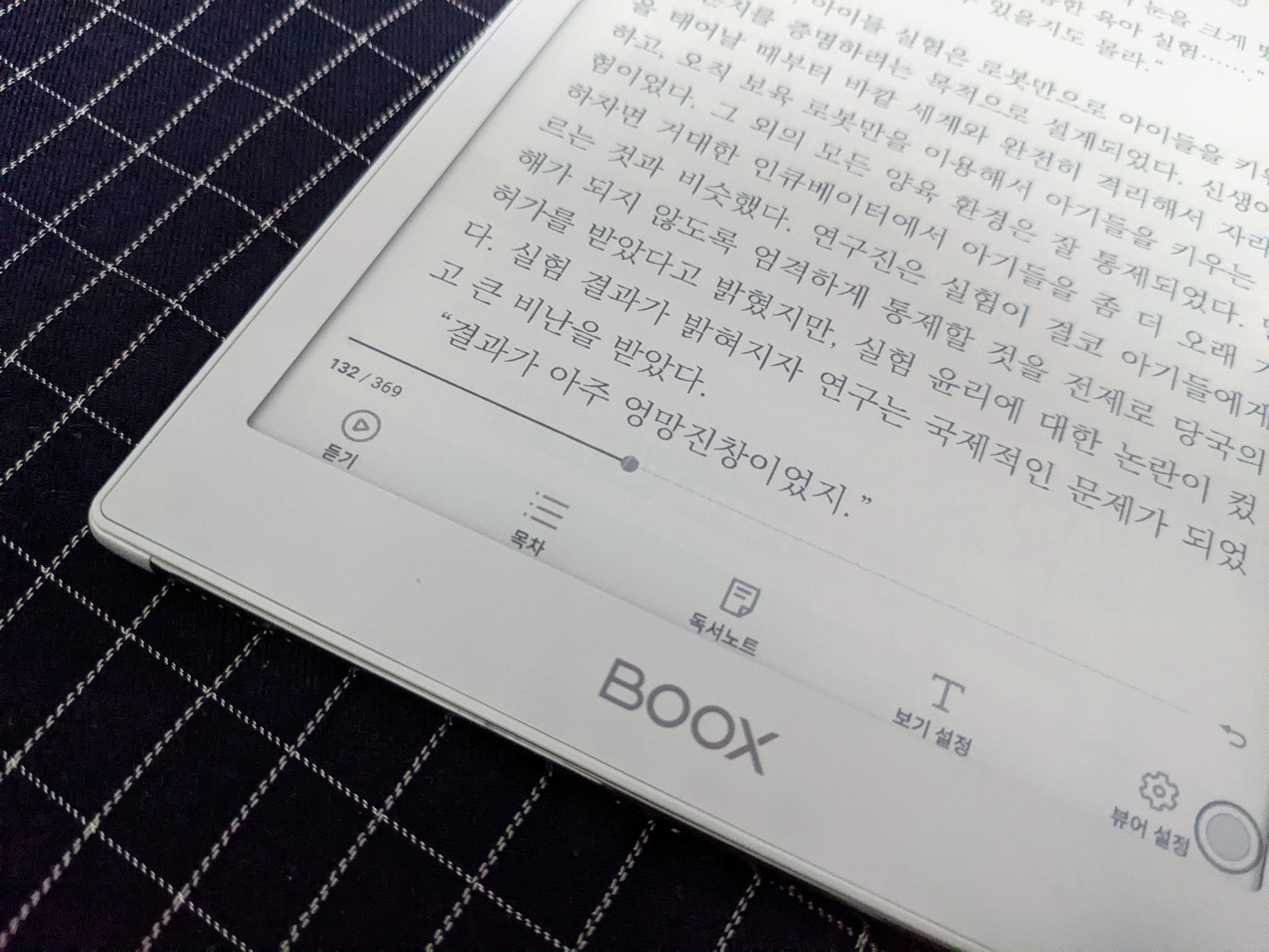 책을 읽는데는 그냥 기본 내장 문서뷰어와 별 차이가 없었다. 아주 미세하게 글씨가 연하다는 점을 제외하면 그냥 책을 읽는것과 차이가 없었고, 페이지를 넘기는데도 전혀 이질감이 느껴지지 않았다.