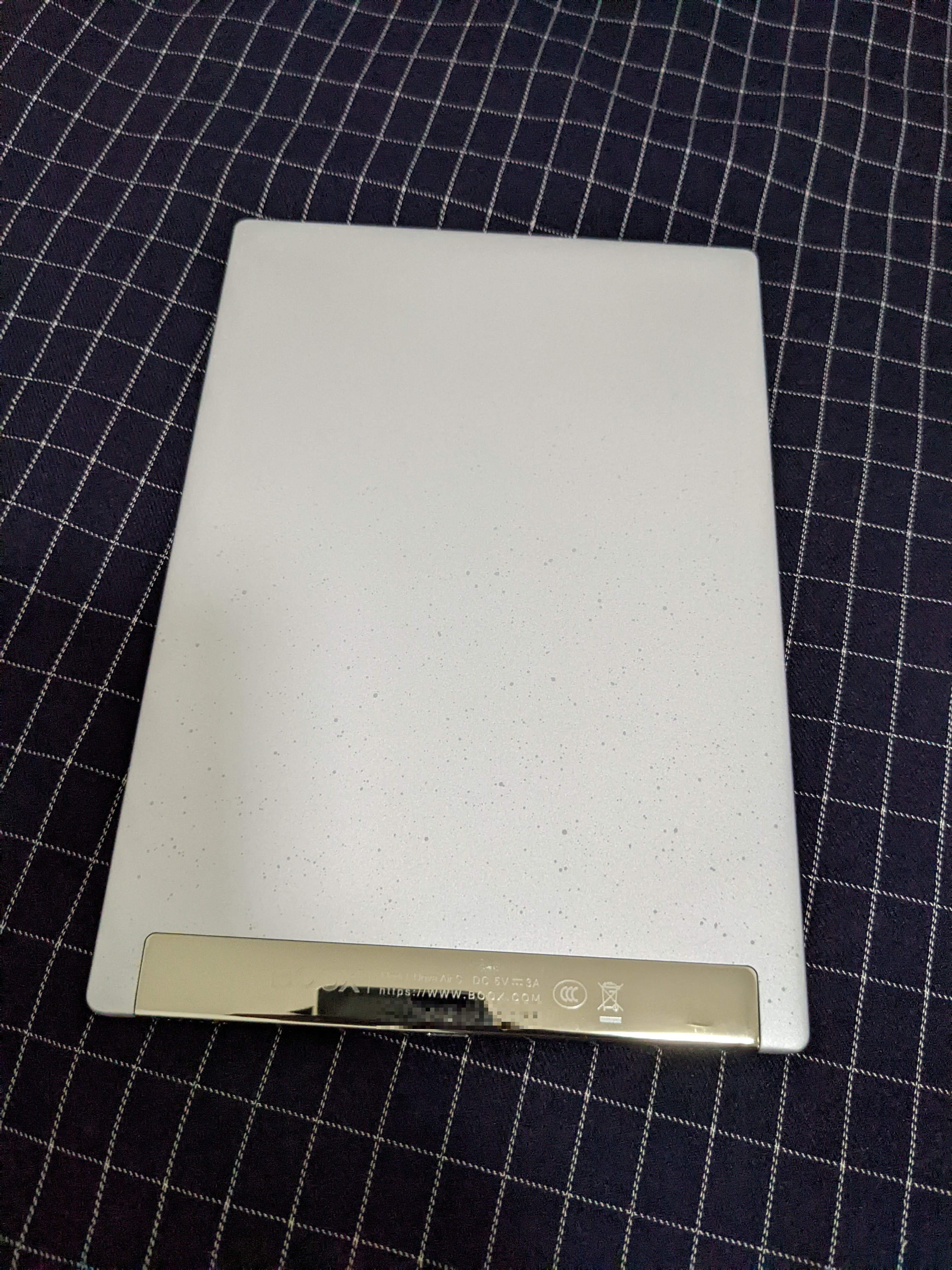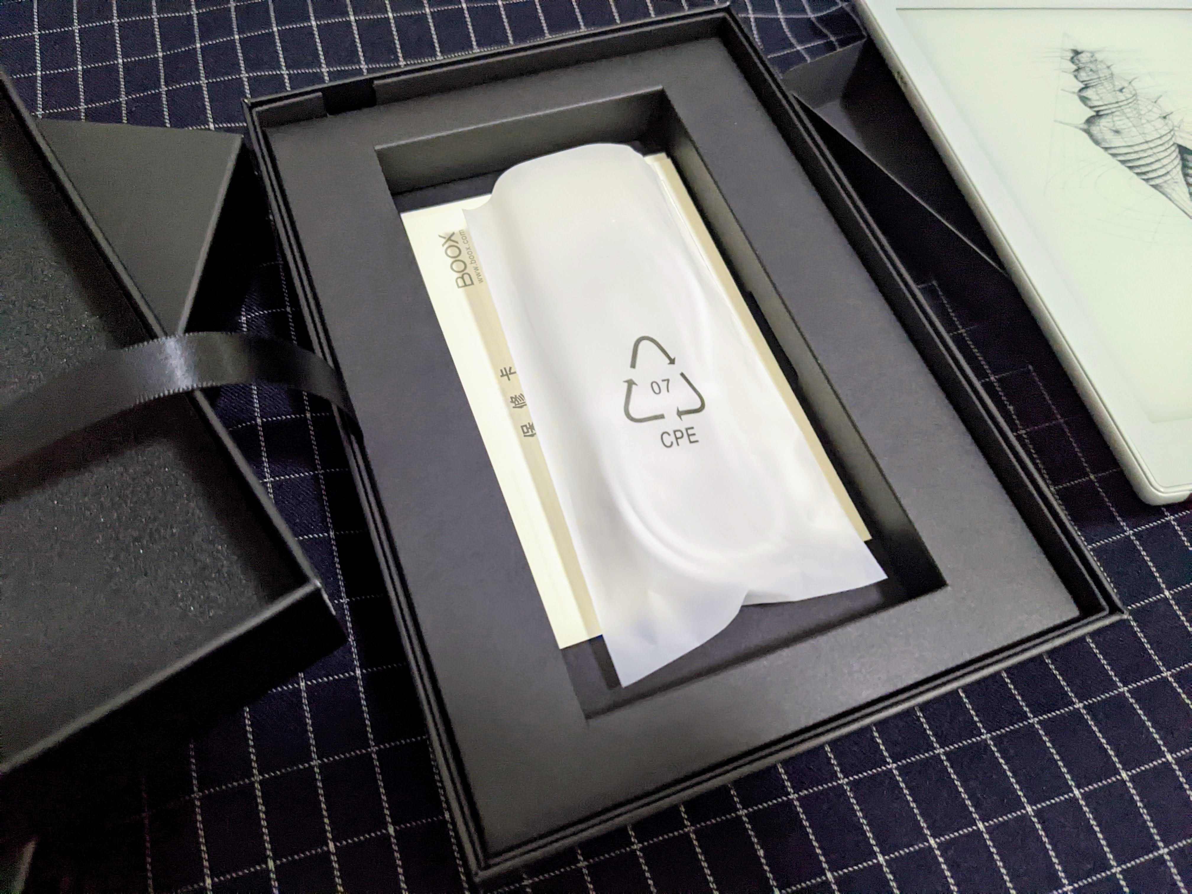 박스를 열면 바로 본체가 등장하는 전형적인 요즘 스마트기기 포장 방식. (원래는 비닐포장으로 감싸져있는데 출근하기 전에 갑자기 택배가 도착해서 퇴근길에 책 읽겠다고 황급히 들고 출근해서... 사실은 다시 넣어놓고 방금 개봉한것처럼 찍은 사진임. 머쓱)