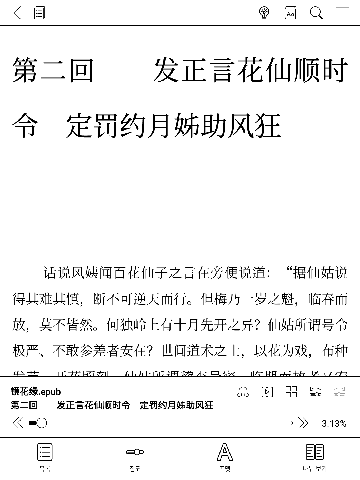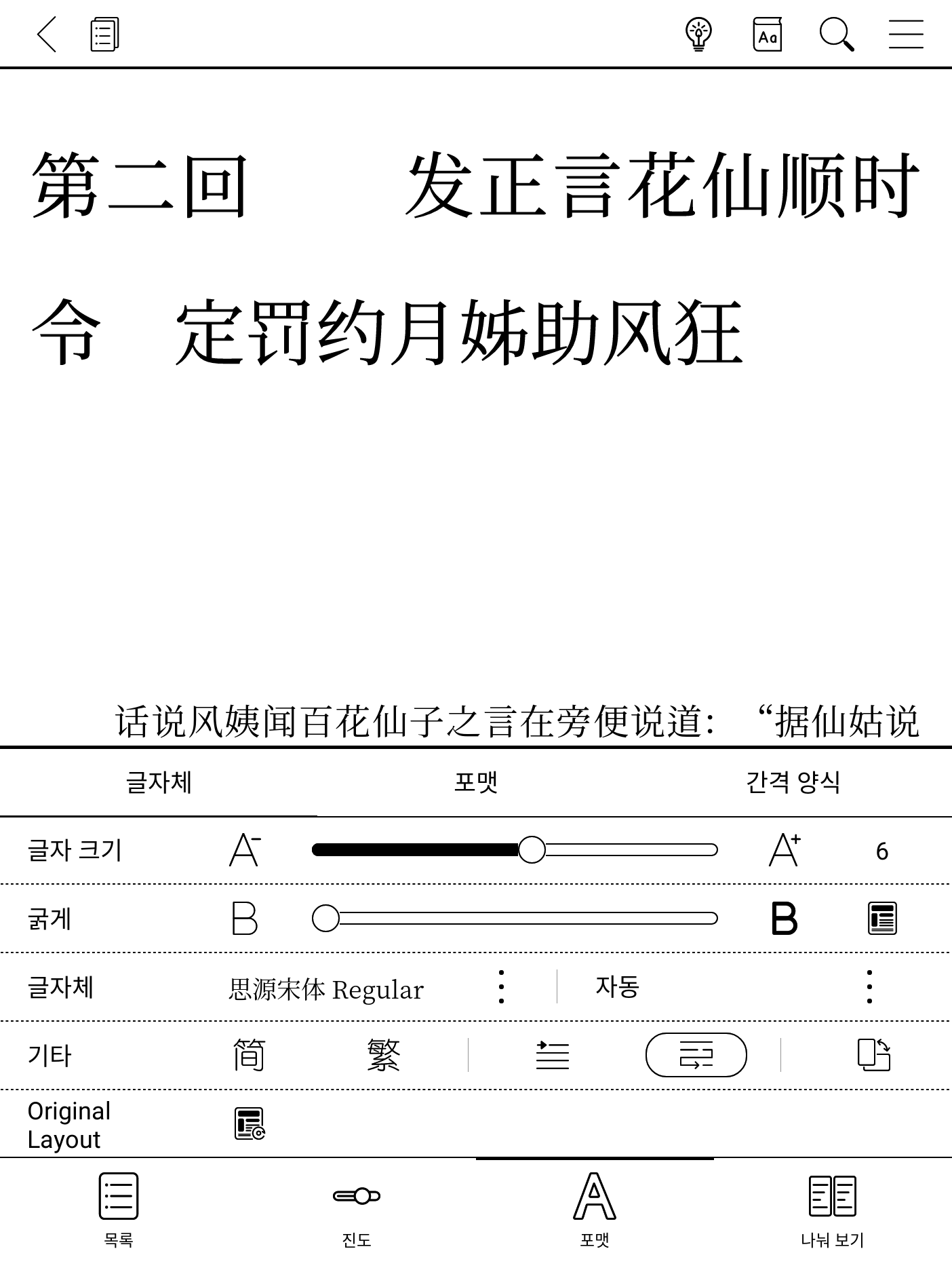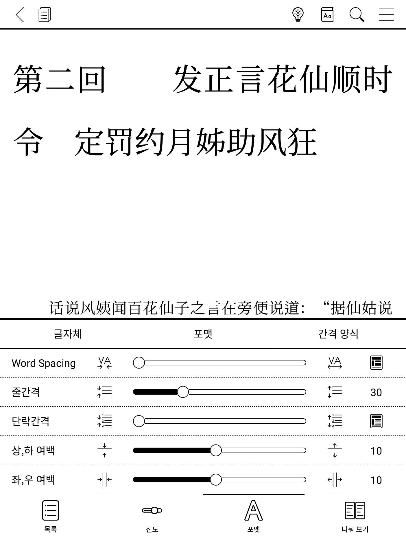 epub 문서 기준으로 글씨체, 글씨 크기, 줄간격같은 기본적인 양식 설정과, 글씨 선명도, 색상처럼 세세한 포맷 설정도 가능하다.