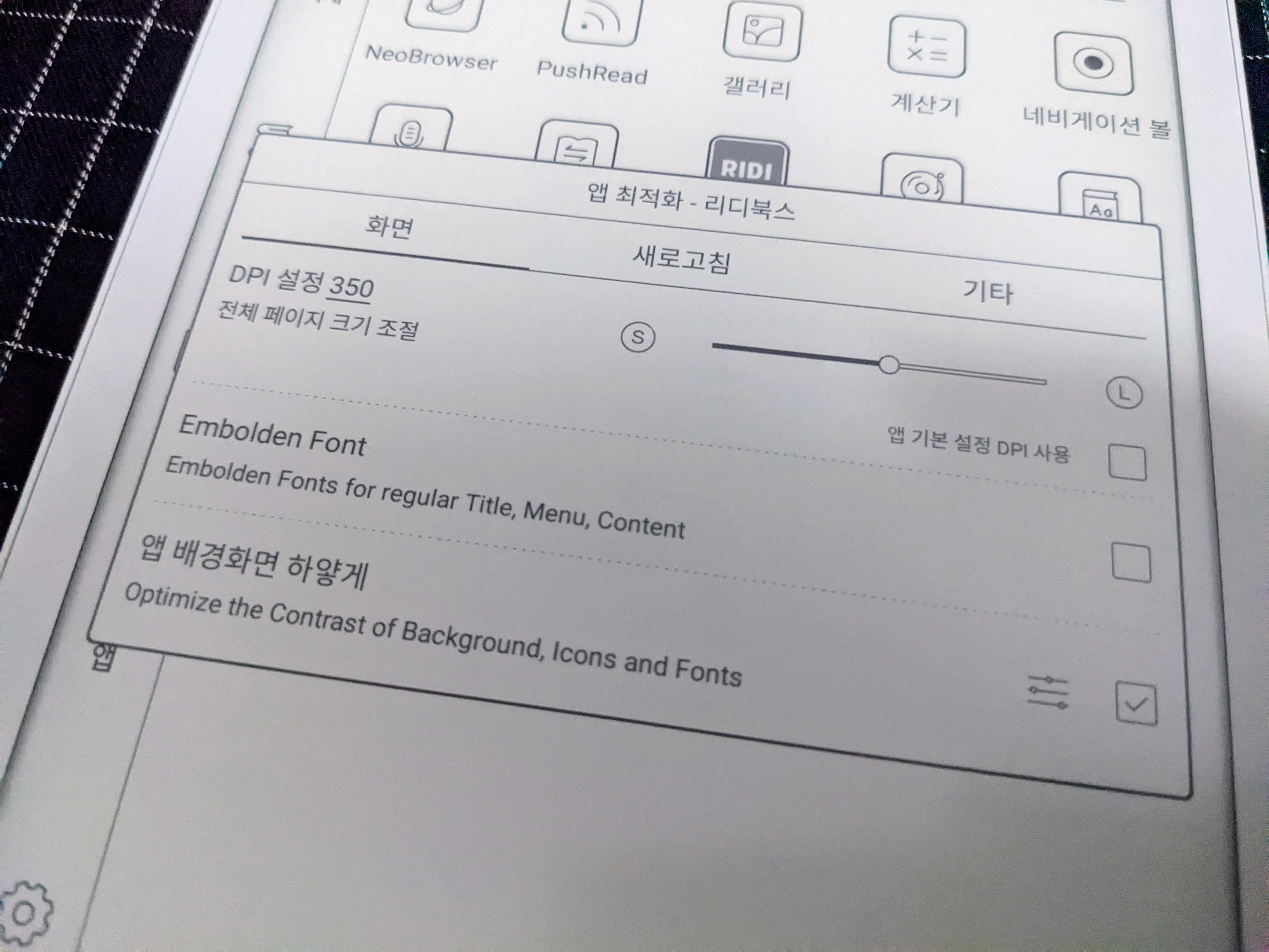 오닉스 북스 제품의 특징 (다른 이북리더에도 있나?) 으로 "서드파티 앱 최적화" 기능이 있다. 홈 런처에서 앱 아이콘을 꾹 눌러 "최적화"로 들어가면, 앱 DPI, 배경화면 하얗게, 글씨체 크기와 색상 등 e잉크 화면에서 "그나마" 잘 보이게 세세한 커스터마이징이 가능하다.