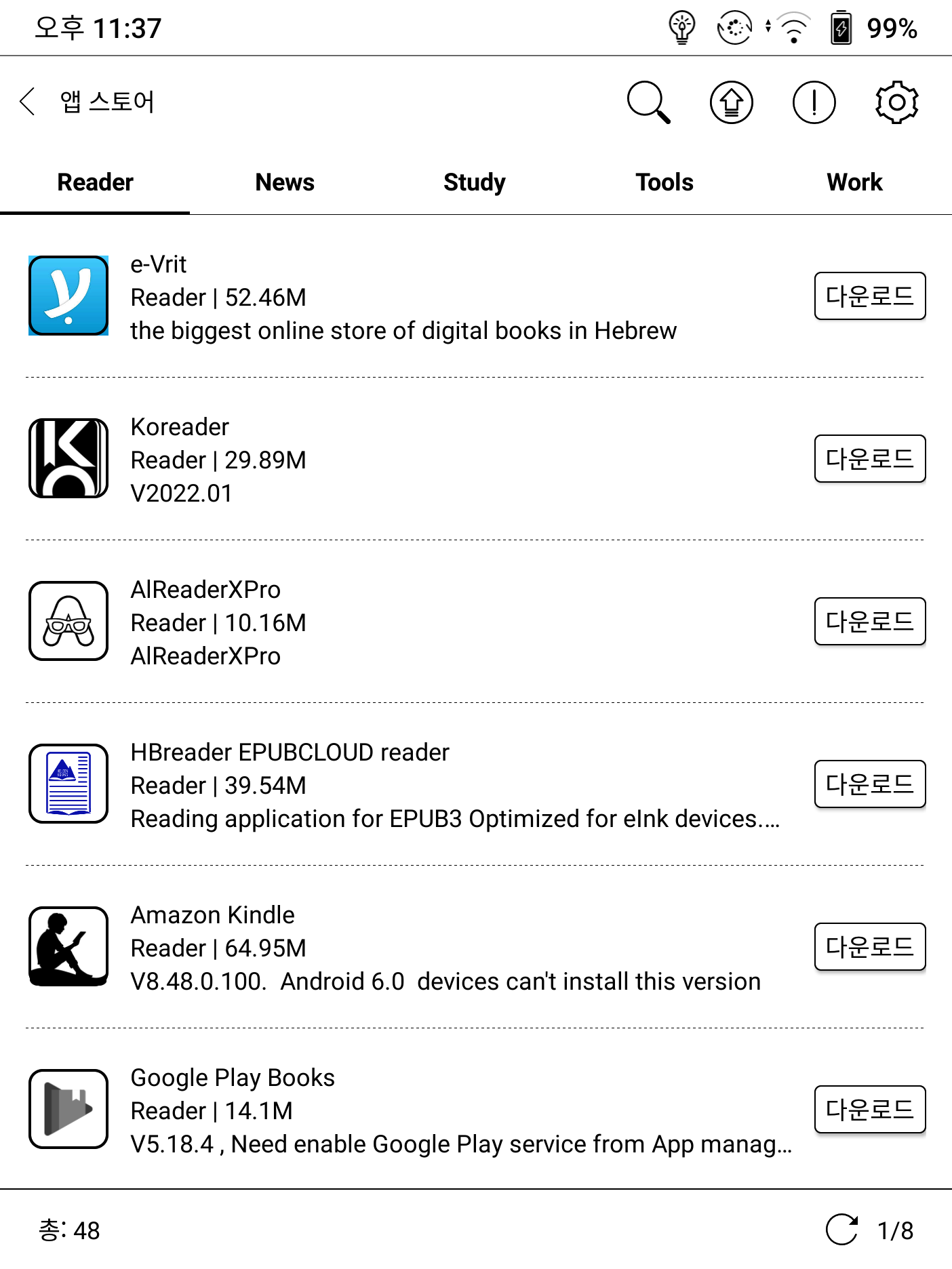 설정에 들어가서 구글 서비스를 활성화시켜 플레이스토어에서 설치해도 되고, 알아서 apk파일을 구해서 설치해도 되고 (예를들면 리디북스 홈페이지에 들어가보면 구글 미지원 기기를 위한 apk파일 다운로드 링크가 있다), 위 사진처럼 기본 내장 앱스토어에 들어가면 많지는 않지만 자주 쓰는 전자책 앱들을 설치할 수 있다.