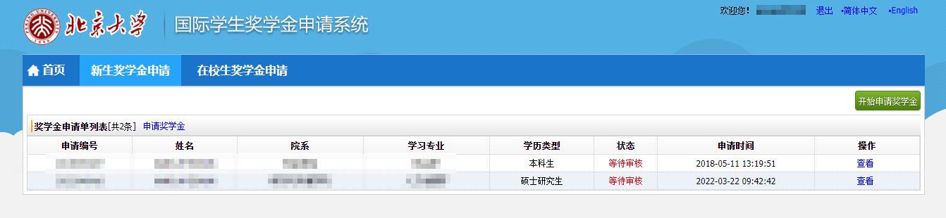 북경대 신청 시스템에 들어가서 首页-奖学金申请-新生奖学金申请-开始申请奖学金을 누르면 장학금 신청 페이지가 나오게 된다. (첫줄은 4년 전 학부 신입생 장학금 신청 기록인데, 실컷 베이징으로 신청서 보내놓고 결국은 탈락했다는 슬픈 이야기... 제작년부턴가 학부생 신입생 장학금은 유학생사무실에서 자동으로 신청해주는걸로 바뀌었다는데 세상 참 좋아진듯.)