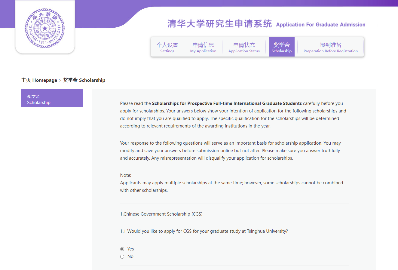 Note: 1. Before you apply for scholarships, complete your application for graduate programs at Tsinghua University first. Tsinghua University only selects scholarship candidates from pre-admitted students. 2. The requirements of scholarships may be differe