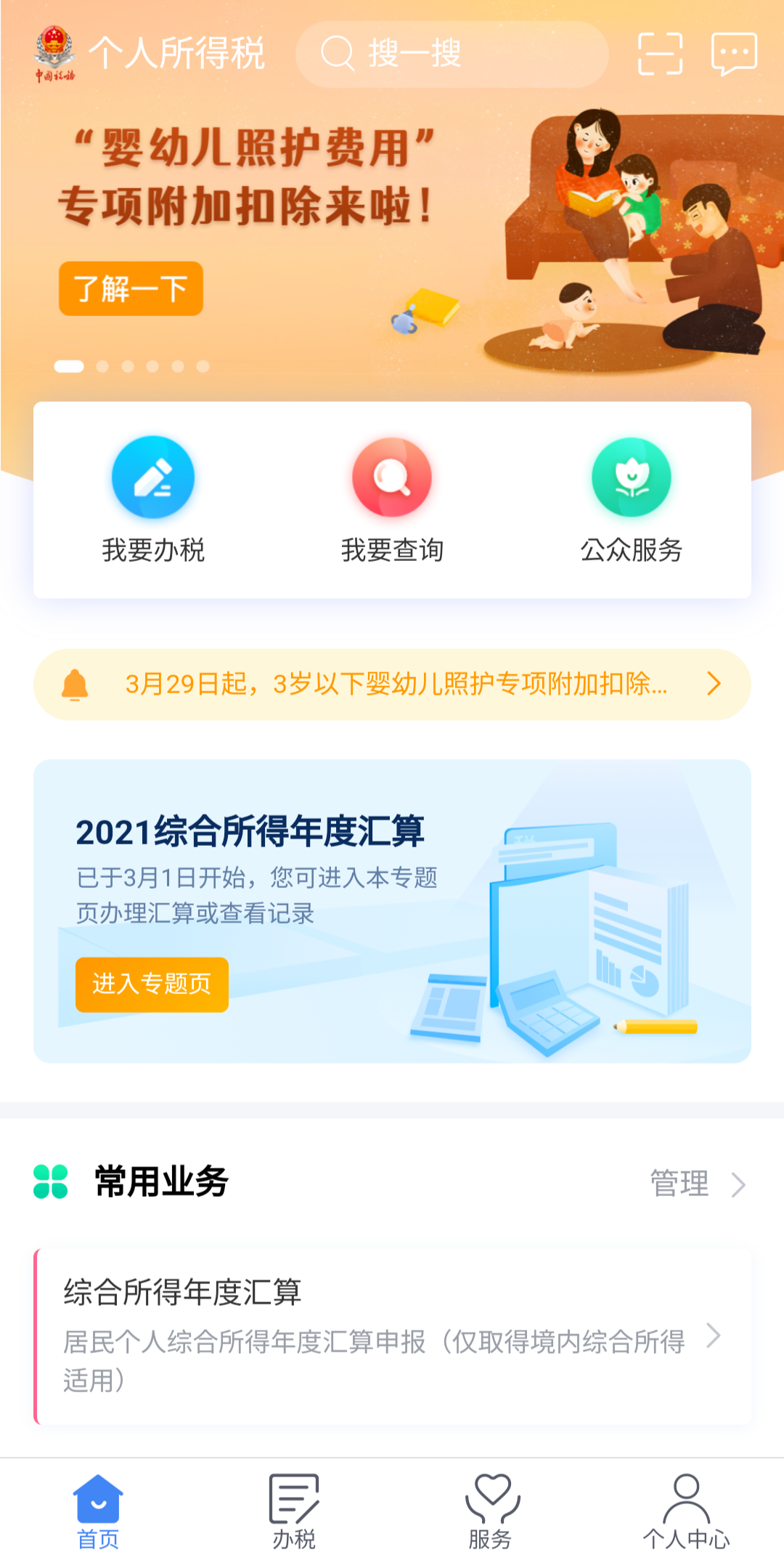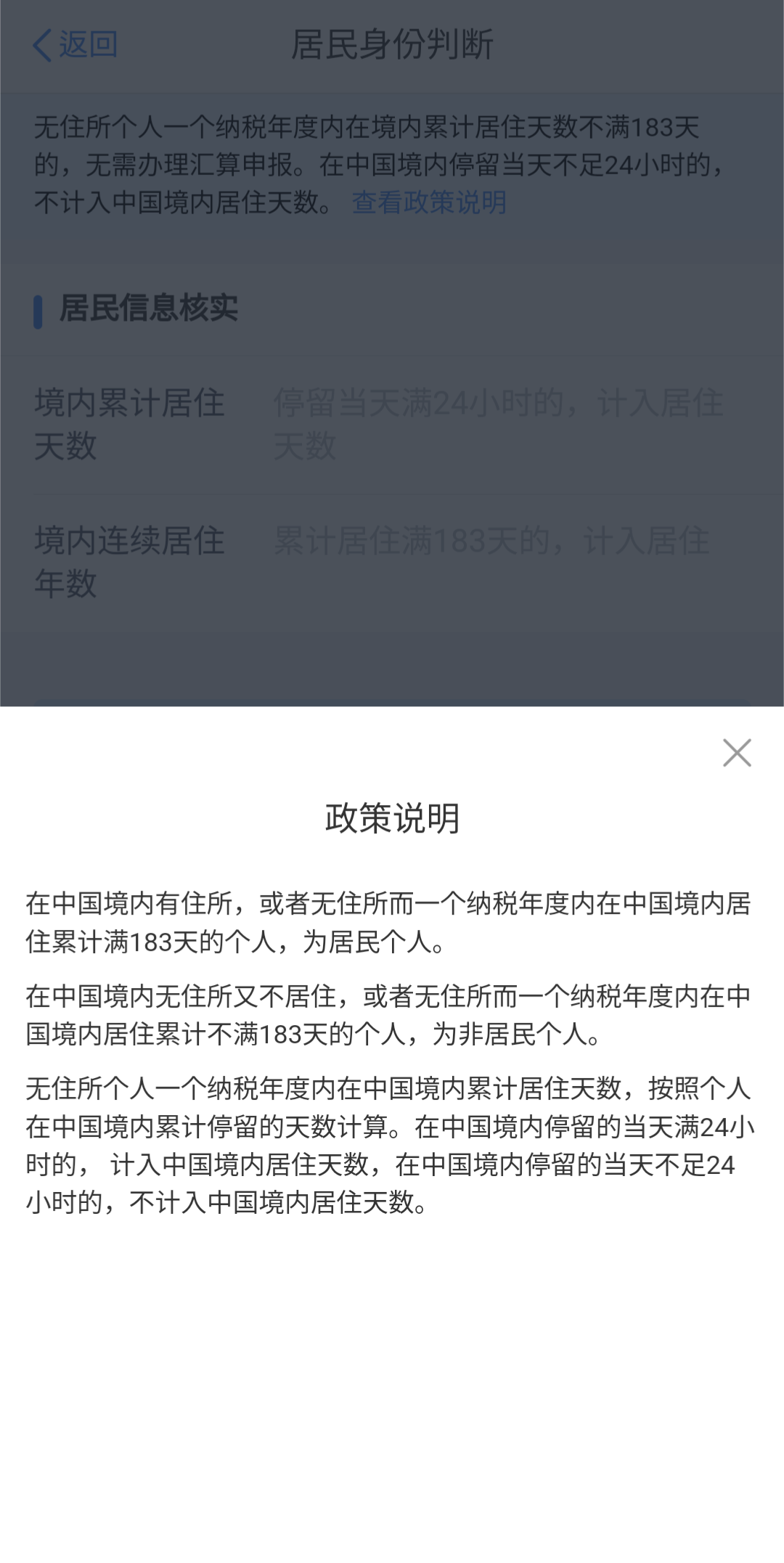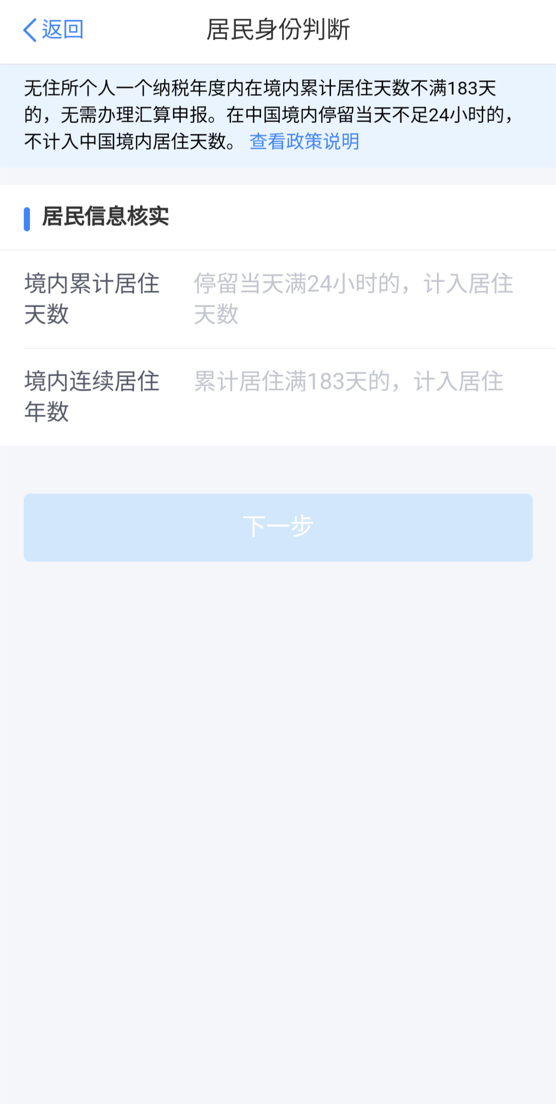로그인 후 홈 화면 我要办税나 하단 办税 메뉴에 들어가서 综合所得年度汇算을 눌러 연말정산을 시작해준다. 외국인이라서 정산 페이지에 들어가기 전 "거민(居民)" 신분을 판단하는 페이지가 있는데, 183일 이상 중국에 거주했으면 居民으로 인정되어 연말정산 대상이 된다.