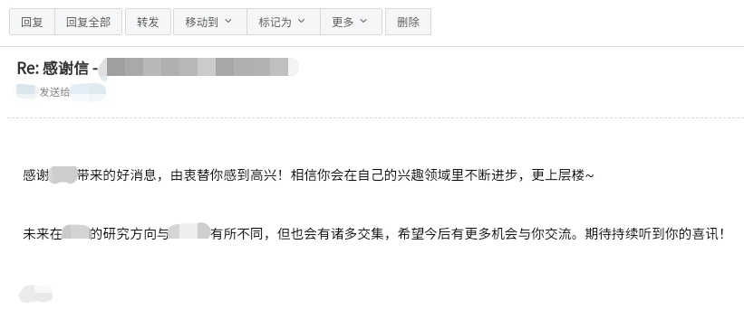 합격이 확정된 후, 추천서를 작성해주신 두 교수님께 감사 메일을 보냈고, 두분 모두 합격을 진심으로 축하한다는 의미의 답장을 써주셨다.