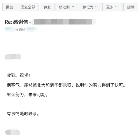당시엔 이미 북경대에 합격이 된 상태였고, 전에 면접을 준비하면서 칭화대는 입학연기 제도가 존재하지 않다는 사실을 확인했고 (학부 졸업 후 군 입대를 할 계획이라 대학원 입학을 2년 유예해야 하는데, 북경대는 흔쾌하게 된다고 답장한 반면 칭화대는 입학 즉시 1년 휴학밖에 불가능하다는 답장을 받았다.) 실무에 치중된 칭화대보다는 이론이나 분석에 치중된 북경대가 내 적성에 더 맞다고 판단되어 북경대 입학을 진작에 결정지은 상태였다.