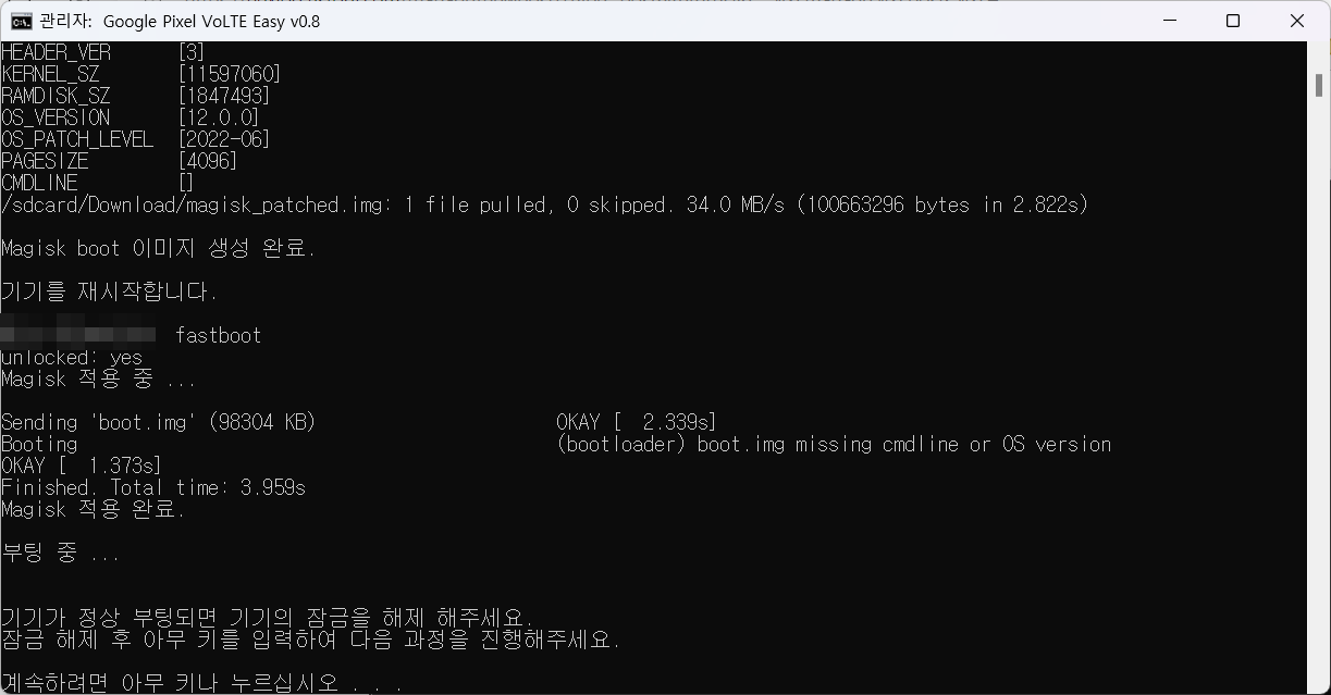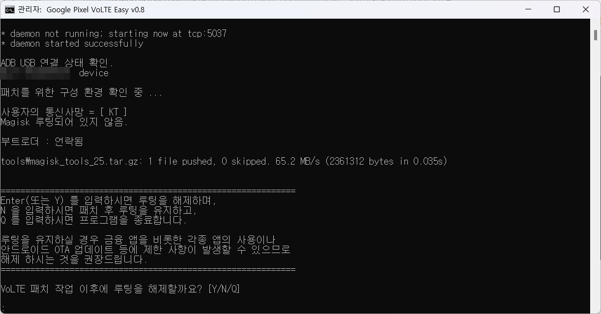 사진과 같이 통신사망, 루팅 상태, 언락 상태를 확인한다. 패치를 위해선 루팅이 필수인데 이 프로그램의 또 다른 장점이 바로 패치 후 알아서 언루팅을 해준다는거다. 금융앱이나 게임을 한다면 루팅을 유지하지 않는게 여러모로 편하니 그래도 엔터를 눌러준다.