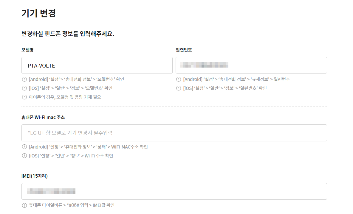 통신사마다 방법은 다르지만 KT망 모빙 기준 정회원 가입 후 마이모빙-기기변경에 들어가서 모델명, 일련번호, IMEI를 적어서 기기정보를 변경할 수 있다. 여기서 모델명은 PTA-VOLTE라고 등록해주고, 휴대폰의 일련번호와 IMEI를 적어준다. (아니면 만능 수단으로 114에 전화해도 된다.)