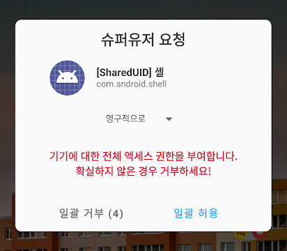 슈퍼유저 요청을 "영구적으로" 상태에서 "일괄 허용" 해준다. 아무래도 휴대폰이 잠시 루팅 상태에 있다보니 토스 앱에서 사용이 제한된다는 푸시알림이 뜨는데, 언루팅하면 모든게 정상으로 돌아오니 무시해주면 된다.