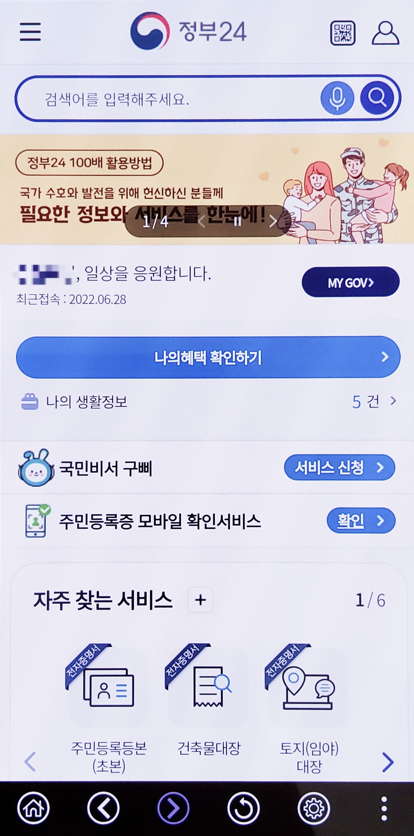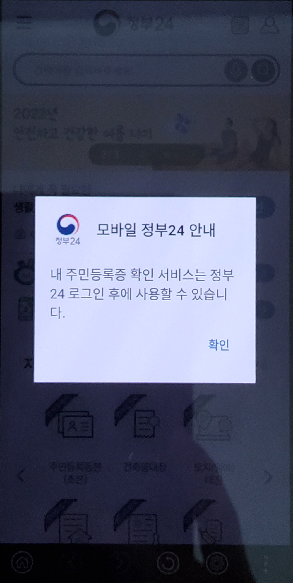 바로 사용할때마다 매번 정부24 앱 로그인을 해야한다. 물론 공동인증서 지문을 등록한다면 그나마 빨리 로그인이 가능하지만, 그래도 정부24 앱 실행-로그인 버튼-지문인증서 선택-지문인증-주민등록증 확인 과정을 거치느니 차라리 지갑을 찾아서 주민등록증을 꺼내는게 더 빠른 것 같다.