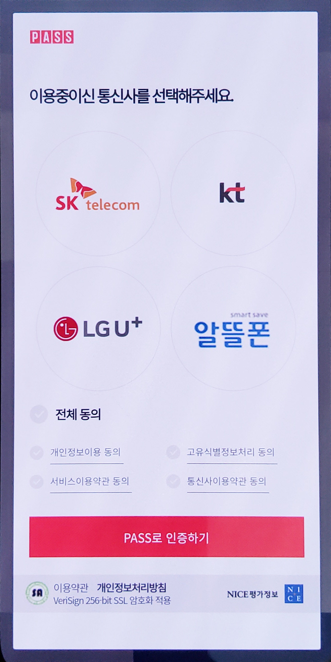 약관동의 후 PASS 앱으로 인증해준다. 무슨 이유에서인지 문자 인증은 지원하지 않는다.